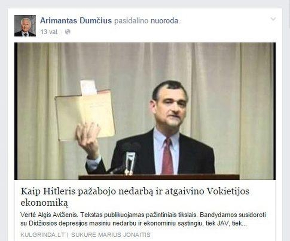 Tėvynės sąjungos – Lietuvos krikščionių demokratų (TS–LKD) narys parlamentaras Arimantas Dumčius teigia, kad straipsniu apie nacistinės Vokietijos ekonomiką socialiniame tinkle pasidalino, siekdamas atkreipti dėmesį į nacizmo ir tautinio šovinizmo keliamą pavojų, kuris išlieka ir šiandien.