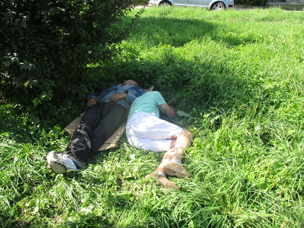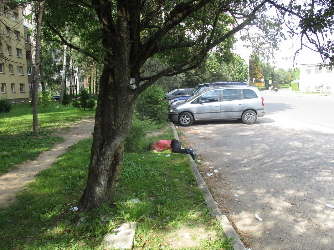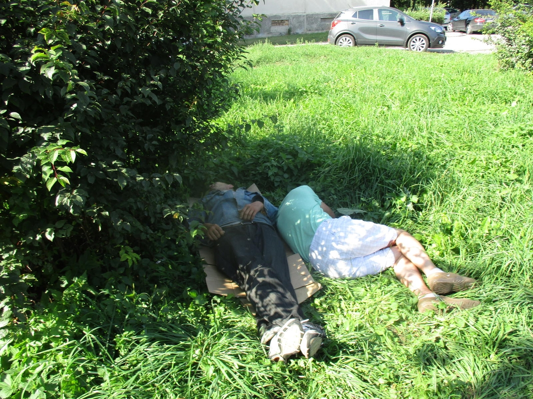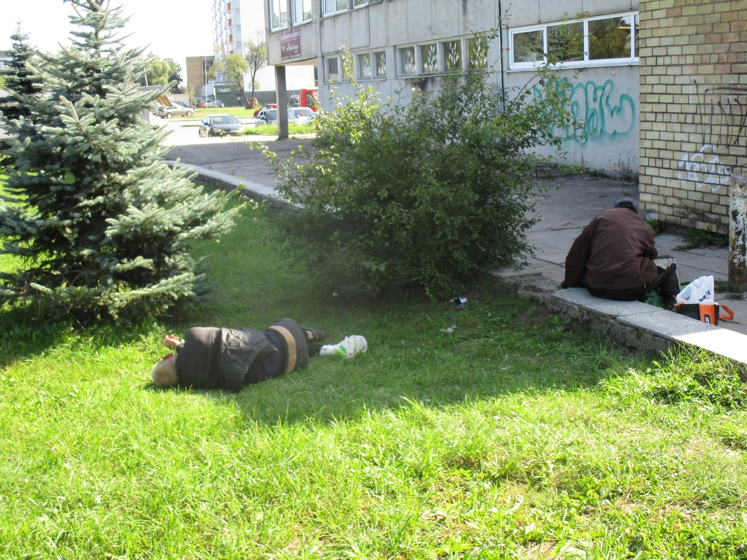 Šiandien po pietų minėtoje vietoje aptikau penkis asocialius piliečius. Ant betoninio bortelio, kaip ir užvakar, sėdėjo ta pati porelė - moteris ir vyras. Šalia jų miegojo ant žolės nuvirtęs labiau „pavargęs“ pilietis.