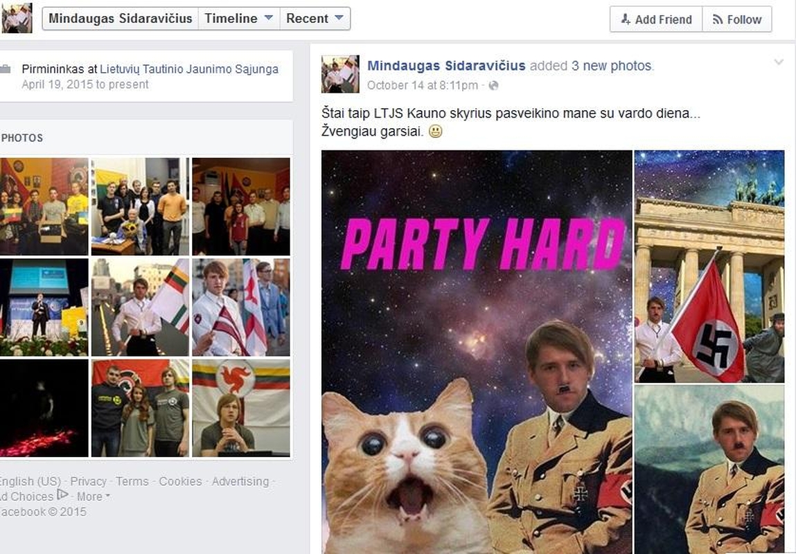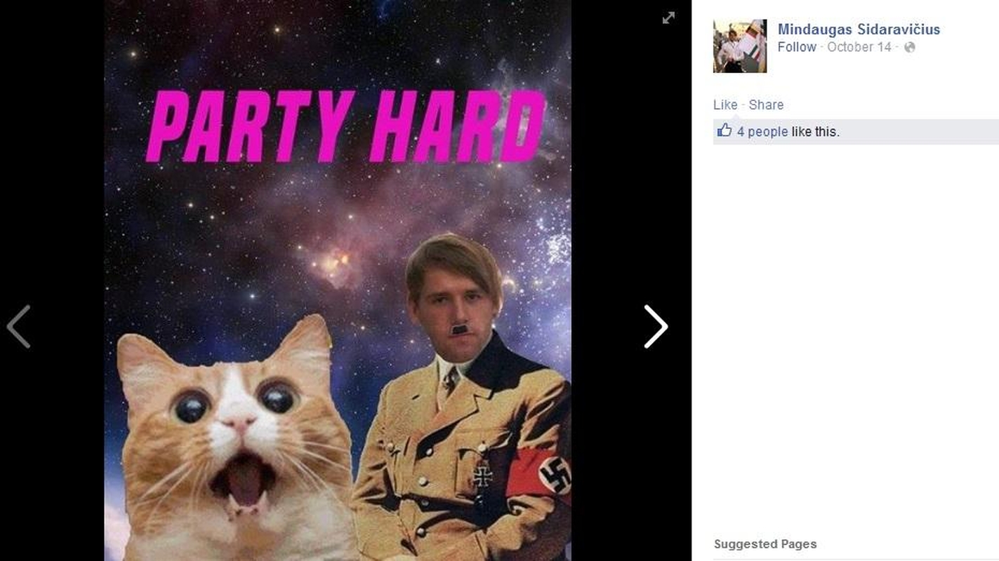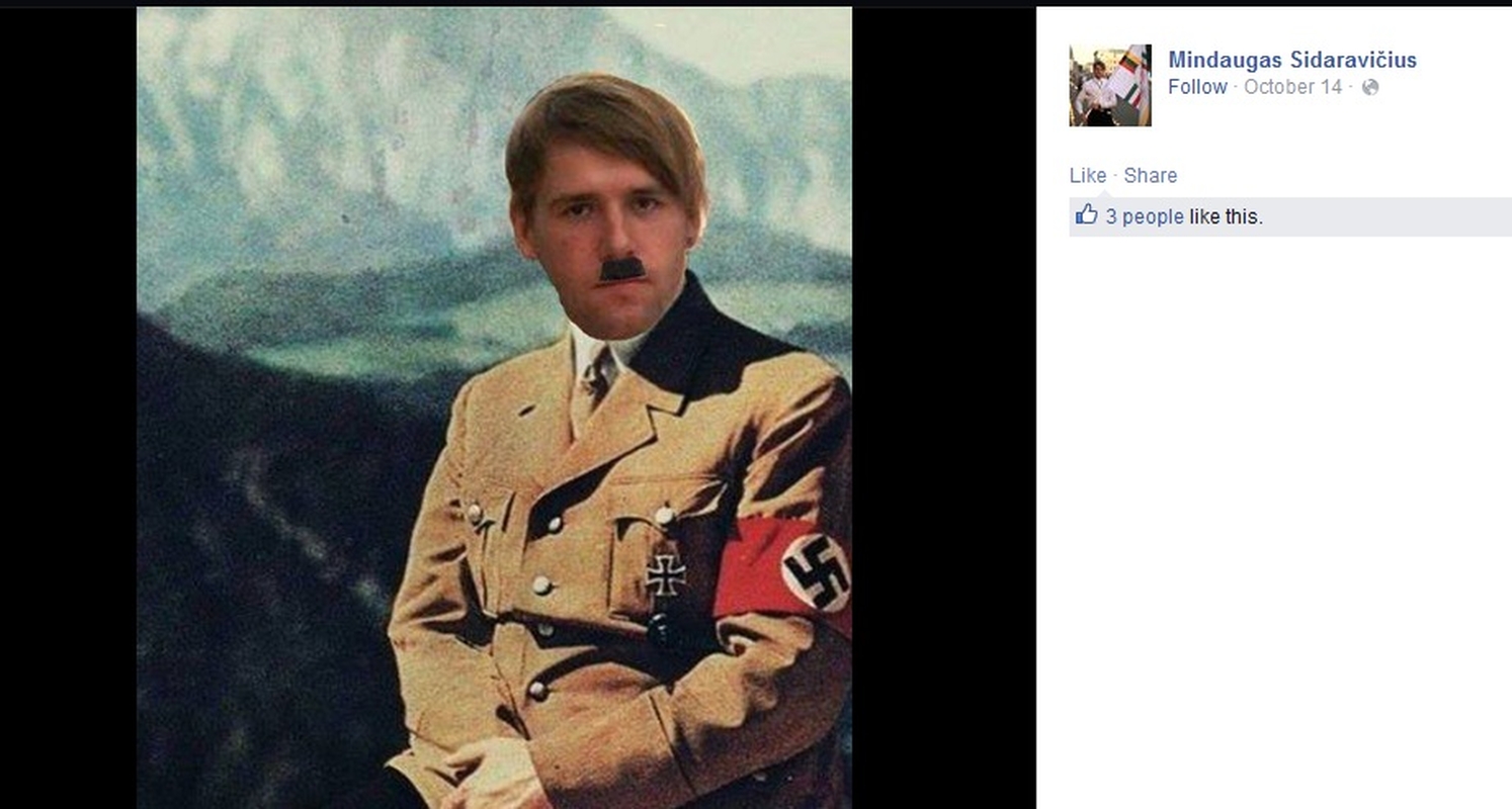 "Štai taip LTJS Kauno skyrius pasveikino mane su vardo diena… Žvengiau garsiai", – rašo sąjungos pirmininkas Mindaugas Sidaravičius savo atvirame "Facebook" profilyje. Nacionalisto juoką sukėlė trys nuotraukos, kuriose jis vaizduojamas kaip A.Hitleris. Dviejose nuotraukose jis ryši SS raištį, o trečioje – stovi prie Branderburgo vartų Berlyne ir neša SS vėliavą, o jam už nugaros bėga chrestomatiškai pavaizduotas žydas.