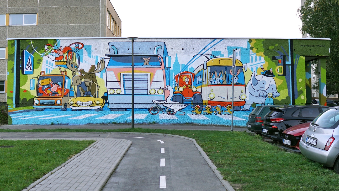 Freskose pavaizduotas miestas, kuriame gyvūnai – vaikams pažįstami ir draugiški personažai – atsakingai elgiasi eisme: praleidžia pėsčiuosius, vadovaujasi kelio ženklais ir rodo gerą pavyzdį kitiems“, – pažymėjo Kauno savivaldybės atstovai.