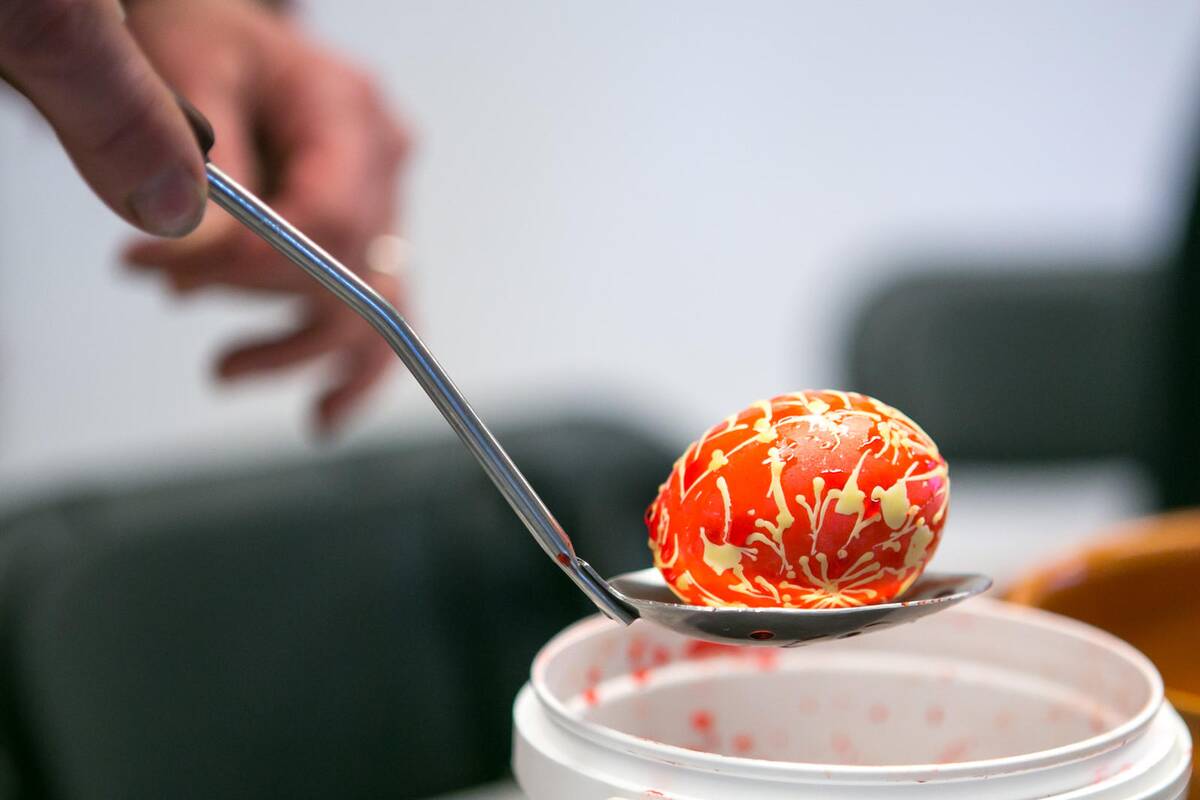 Išmargintus kiaušinius R.Šuopienė merkė į paruoštus dažus, o ištraukusi dėjo ant laikraščio. Ji pabrėžė, kad reikia leisti dažams visiškai nudžiūti, nepulti iš karto šluostyti. Nudažytų margučių vaško skusti negalima – kiaušinį palaikius virš žvakės vašką reikia nušluostyti servetėle įtrinant jį į lukštą. Kai kiaušinis pasidengia vašku, dažai taip greitai nenublunka.