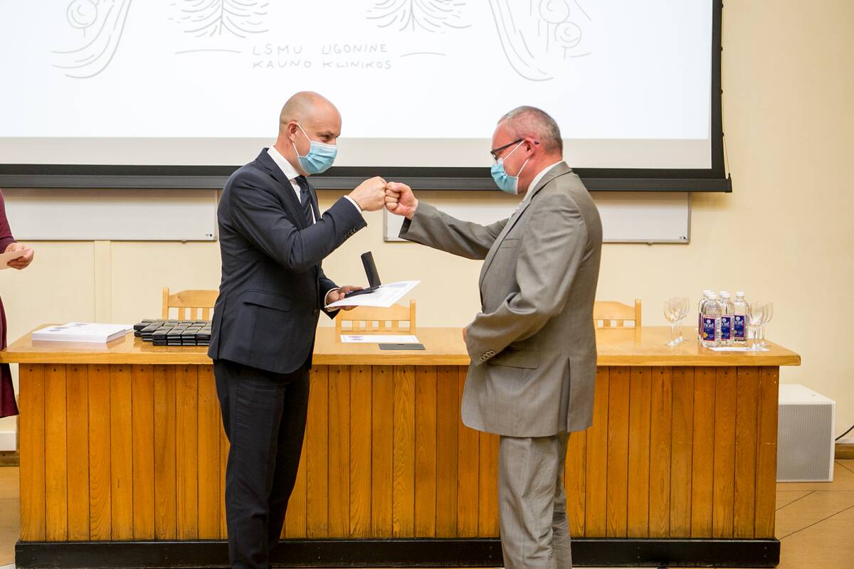 Lietuvos sveikatos mokslų universiteto ligoninės Kauno klinikose pirmadienį apdovanoti Kauno regiono medikai, kurių pastangos padėjo suvaldyti koronaviruso (COVID-19) pandemiją. Dėkodamas už pasiaukojantį darbą, sveikatos apsaugos ministras Aurelijus Veryga jiems įteikė medalius „Už reikšmingą indėlį Lietuvos žmonių sveikatai“.