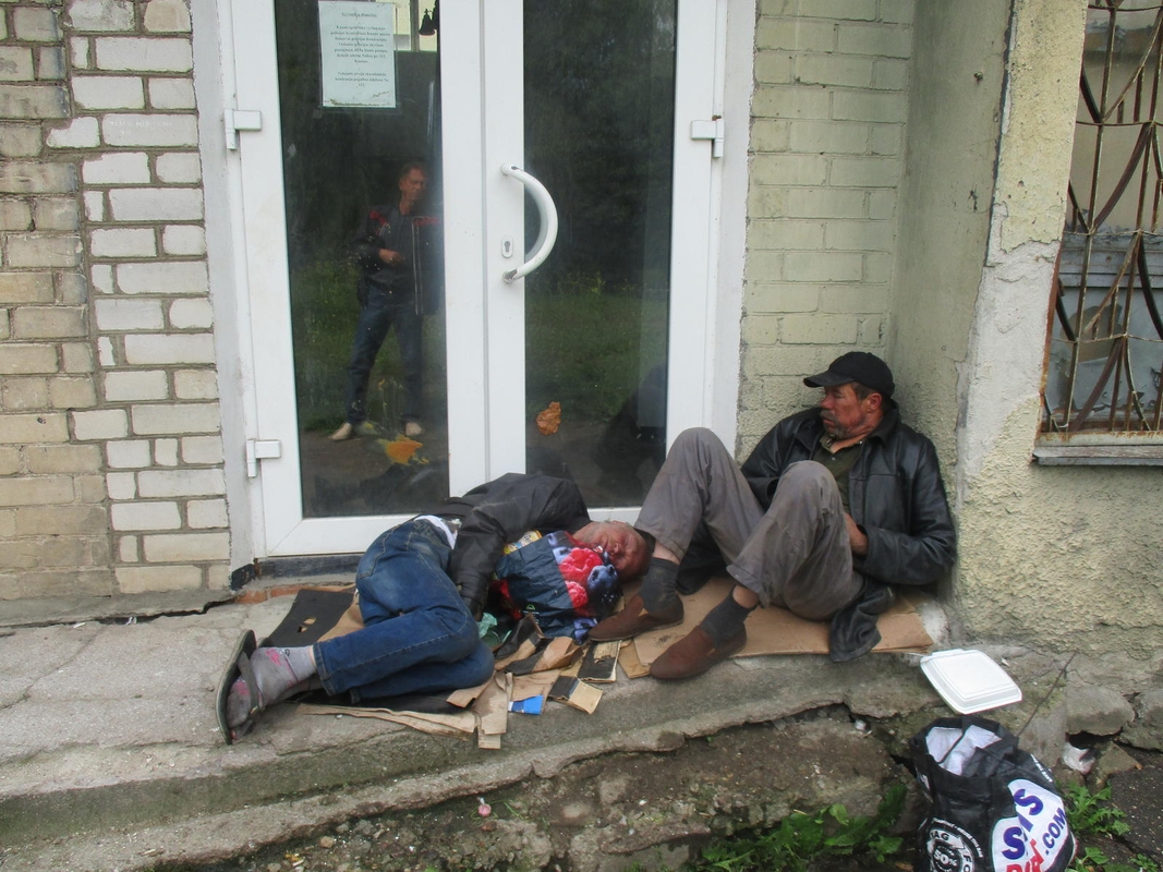 Du vidutinio amžiaus vyriškiai miegojo K.Baršausko ir M.Romerio gatvių sankirtoje, prie pat vaistinės. Jie atrodė gerokai prisivaišinę – vienas vyrukas, išsitiesęs ant betoninio luito, buvo išgėręs ir šalia numetęs pigaus vyno butelį, o jo draugas snaudė sėdėdamas. Pastarasis vyno iki dugno dar nebuvo ištuštinęs.