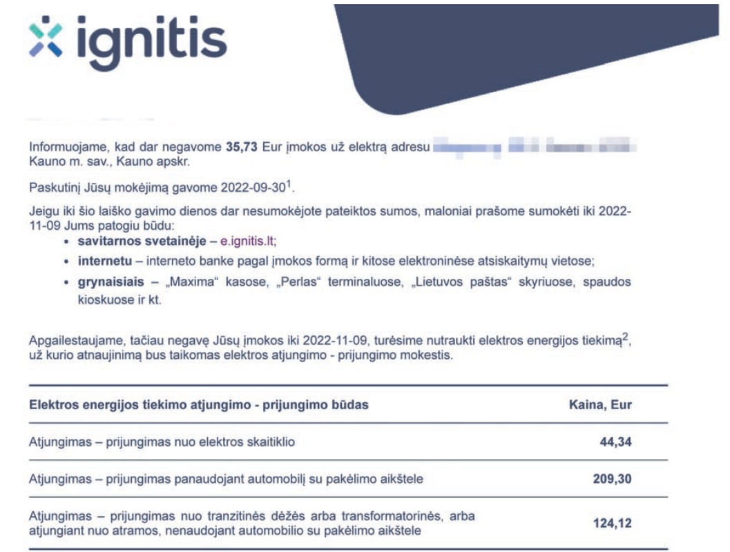 Nepatingėta surašyti ir atjungimo ir prijungimo kainas: „Atjungimas–prijungimas nuo elektros skaitiklio – 44,34 euro, atjungimas–prijungimas panaudojant automobilį su pakėlimo aikštele – 209,30 euro, atjungimas–prijungimas nuo tranzitinės dėžės arba transformatorinės, arba atjungiant nuo atramos, nenaudojant automobilio su pakėlimo aikštele, – 124,12 euro.“