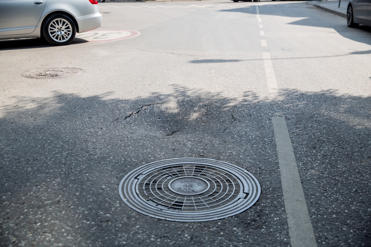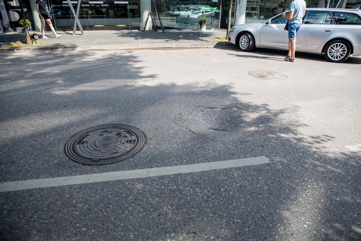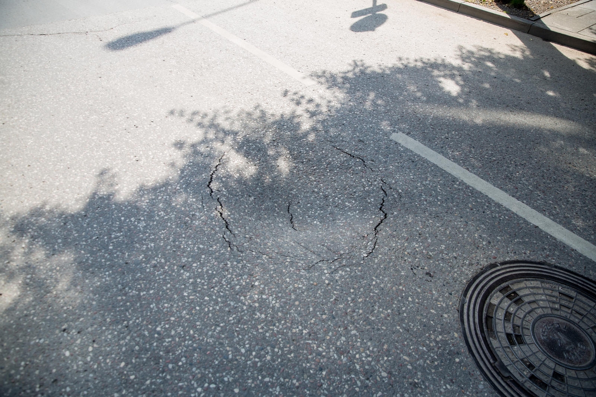 Akivaizdu, kad po asfalto sluoksniu yra tuščia ertmė. Nežinia, kokio ji gylio.