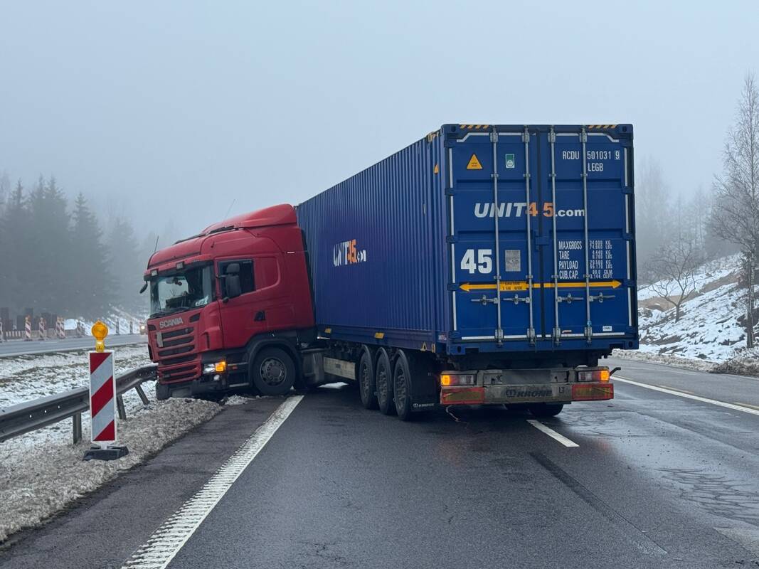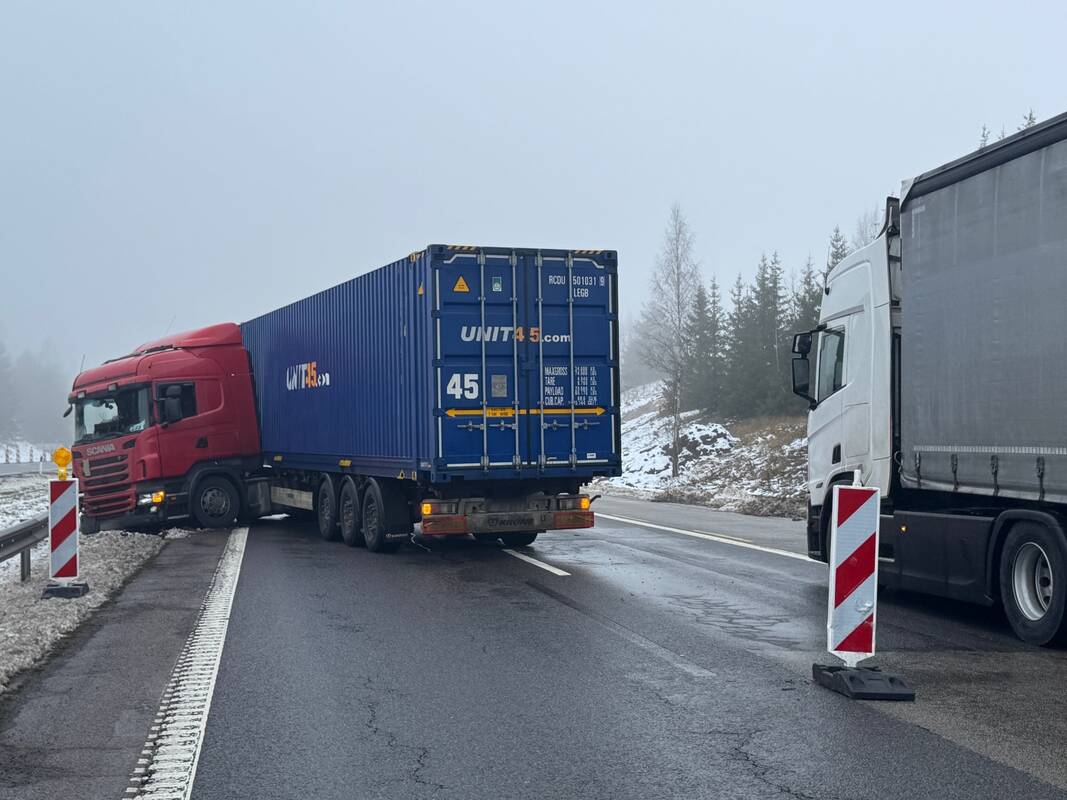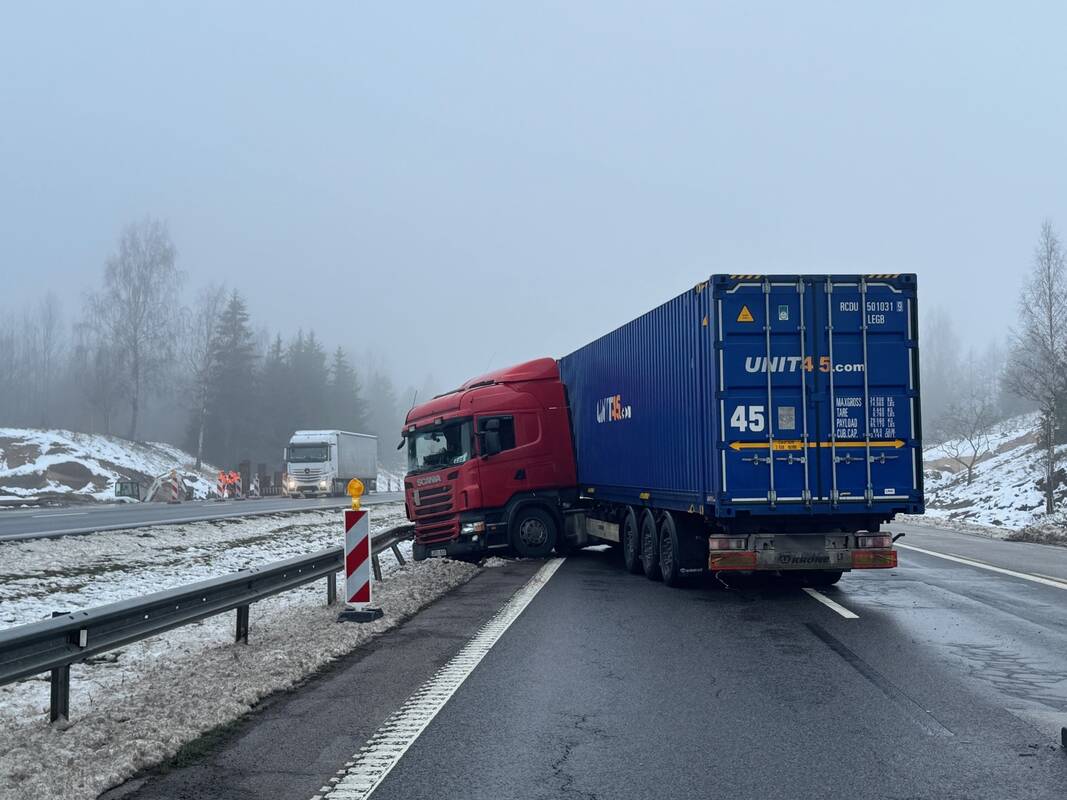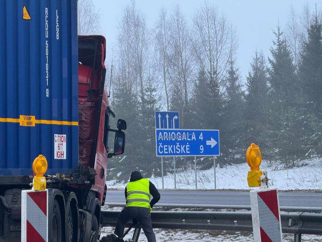 9.17 val. vilkiko „Scania“ vairuotojas policiją informavo, kad atsitrenkė į atitvarus.