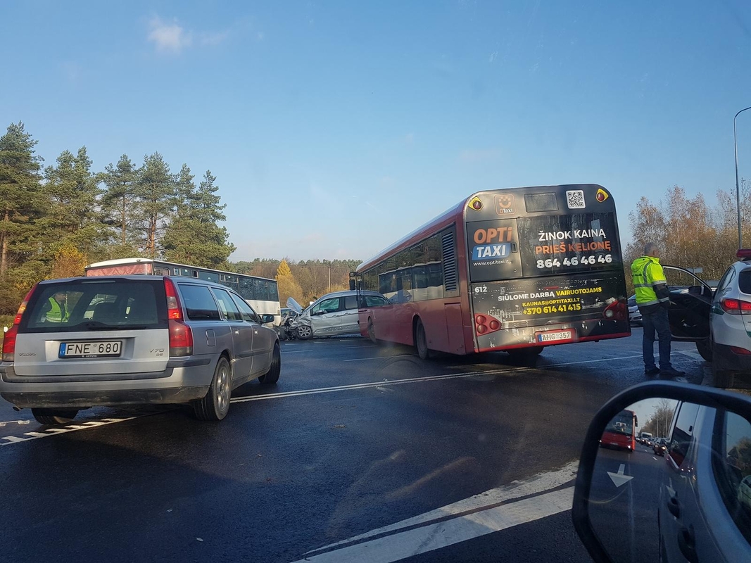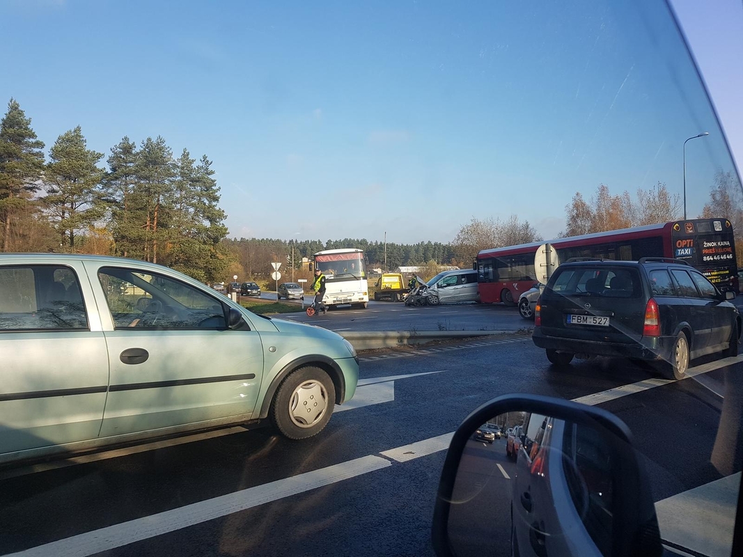 Pasak pareigūnų, šioje vietoje susidūrė dvi transporto priemonės. Jų patiksinti policija negalėjo, tačiau kitų vairuotojų nuotraukose matoma, kad į avariją pakliuvo lengvasis automobilis ir Kauno viešajam transportui priklausantis autobusas.