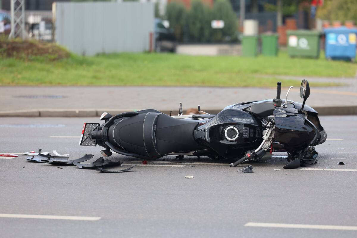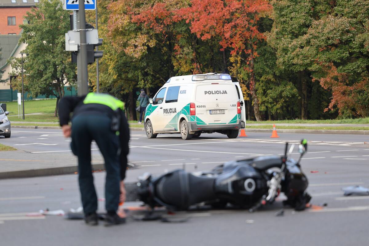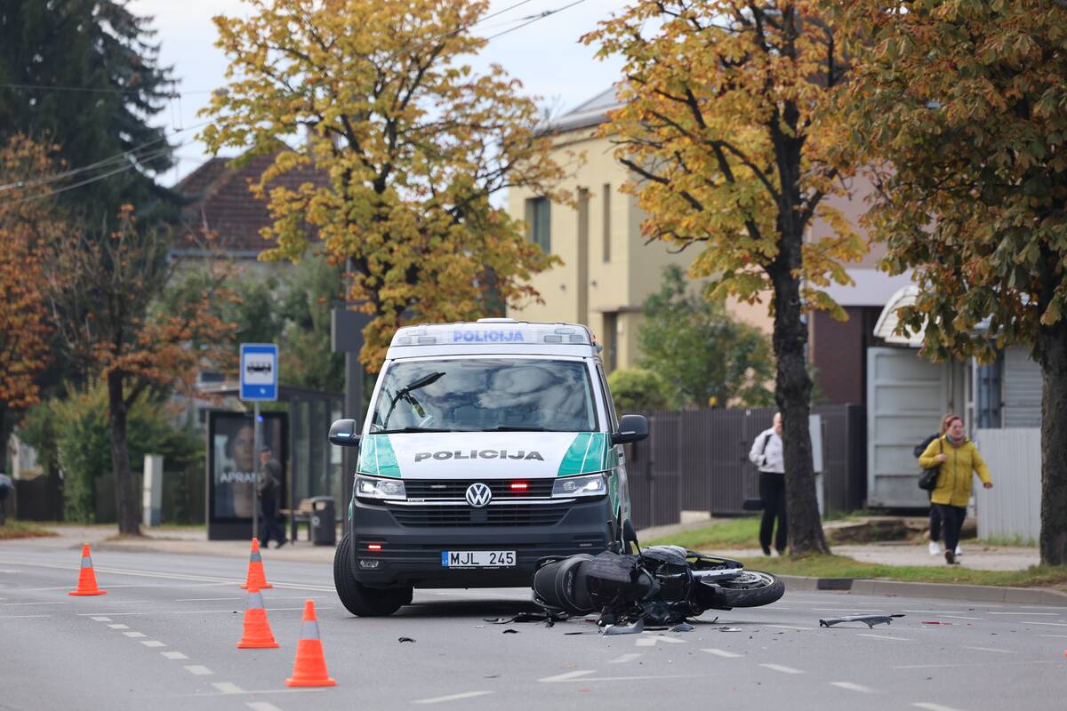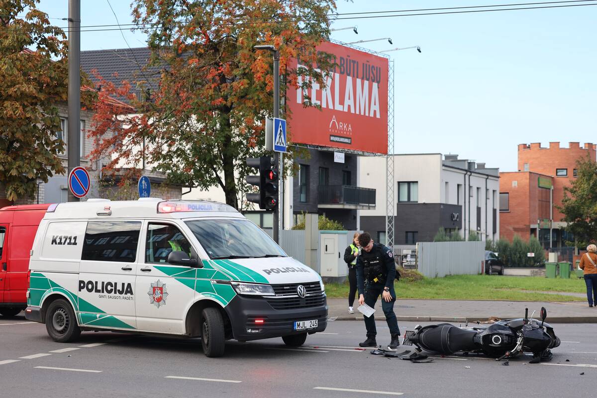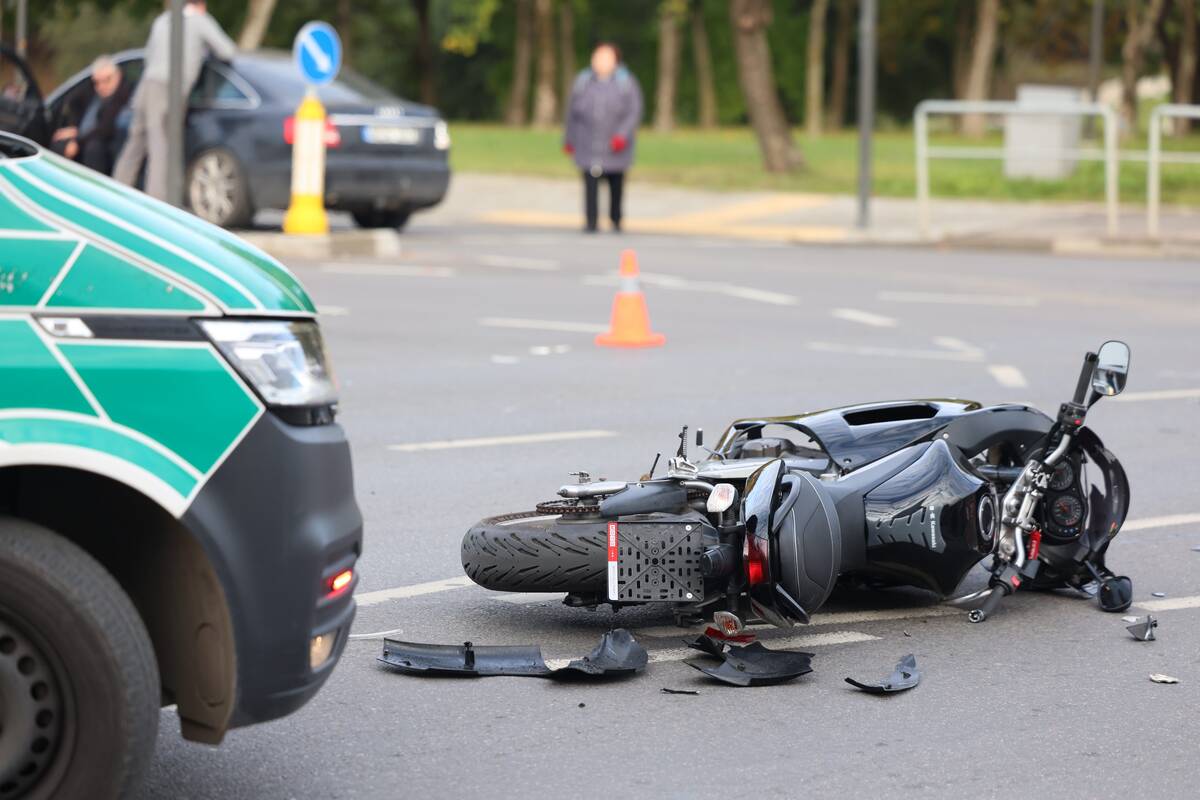 Sankryžoje susidūrė „Audi“ automobilis ir motociklas. Kaip teigė policijos atstovas, nukentėjo motociklo vairuotojas, pirminiais duomenimis, jam sužalota koja.