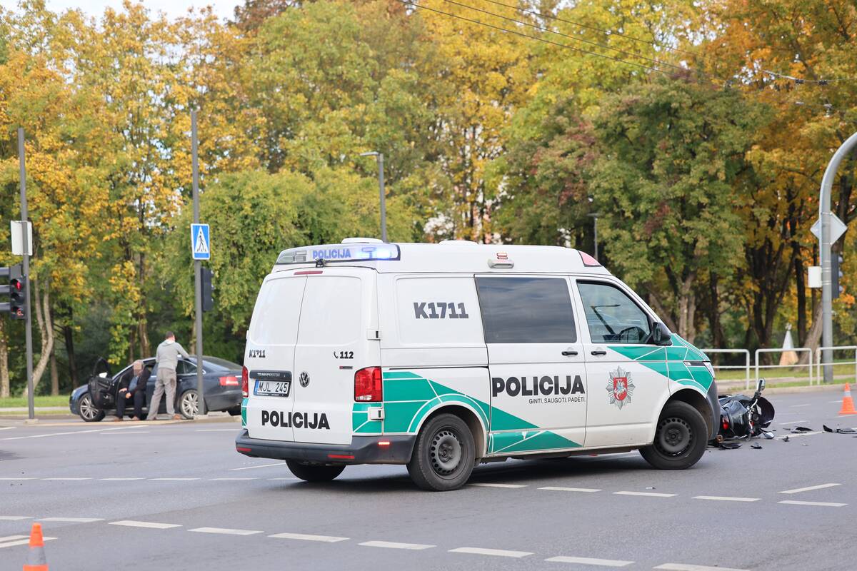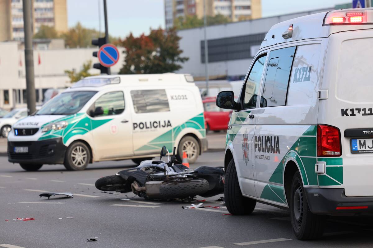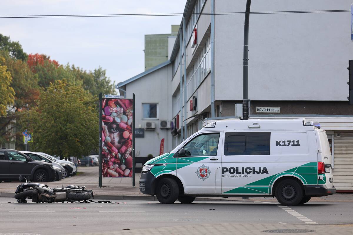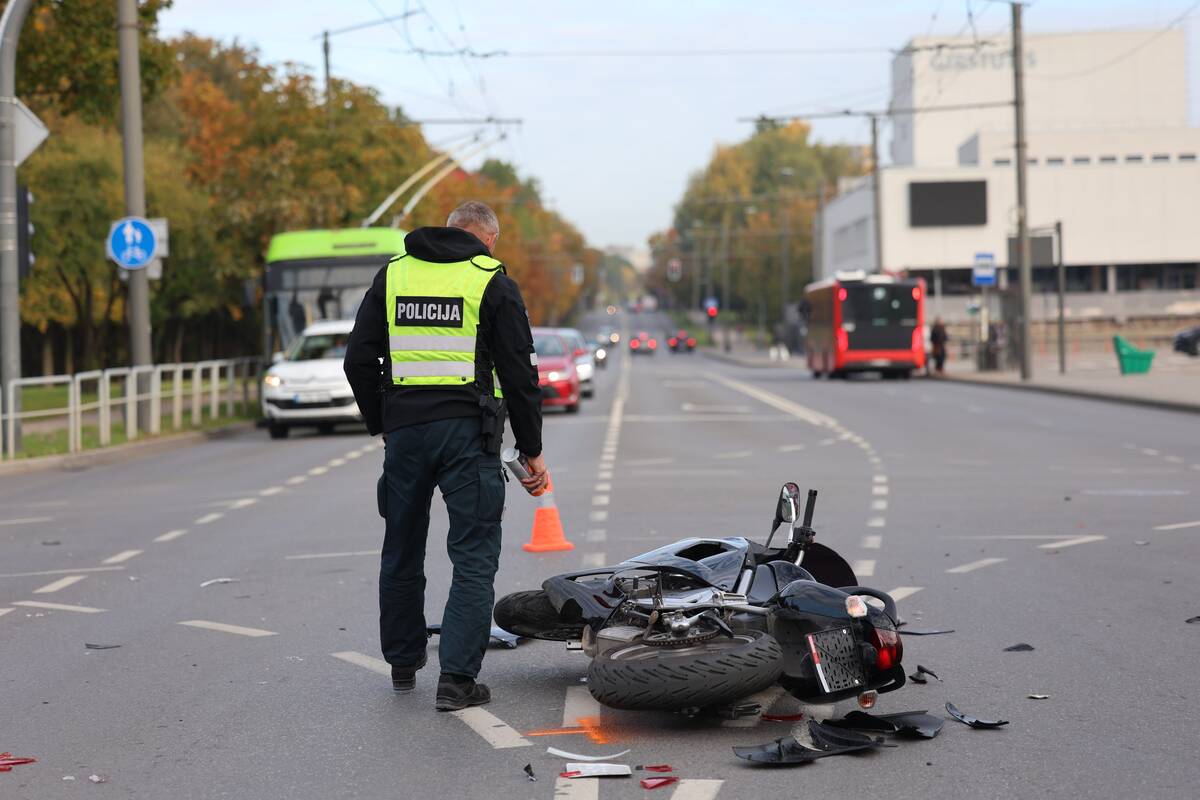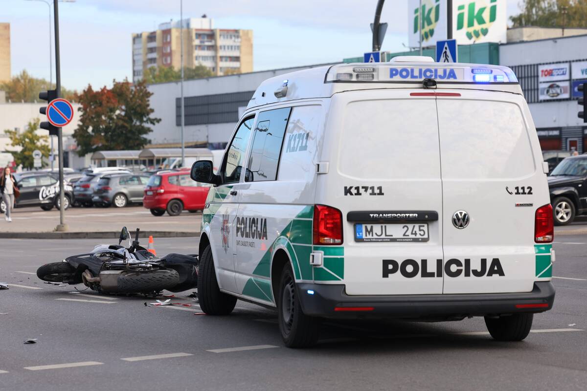 Sankryžoje susidūrė „Audi“ automobilis ir motociklas. Kaip teigė policijos atstovas, nukentėjo motociklo vairuotojas, pirminiais duomenimis, jam sužalota koja.