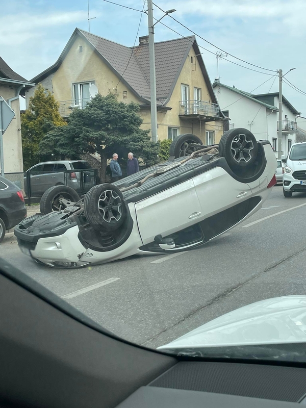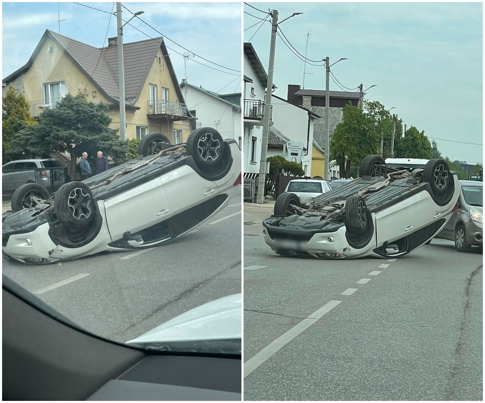 Automobilis apvirto ir liko gulėti ant stogo viduryje gatvės.