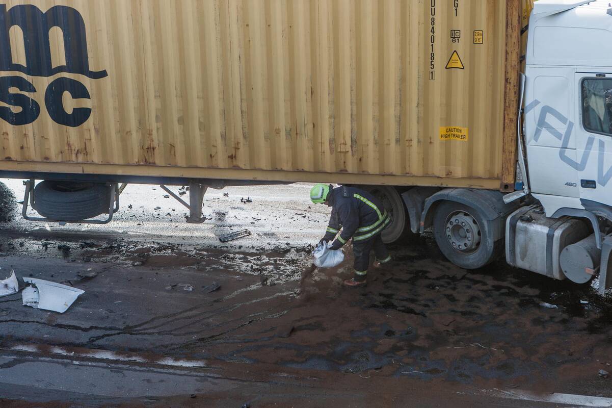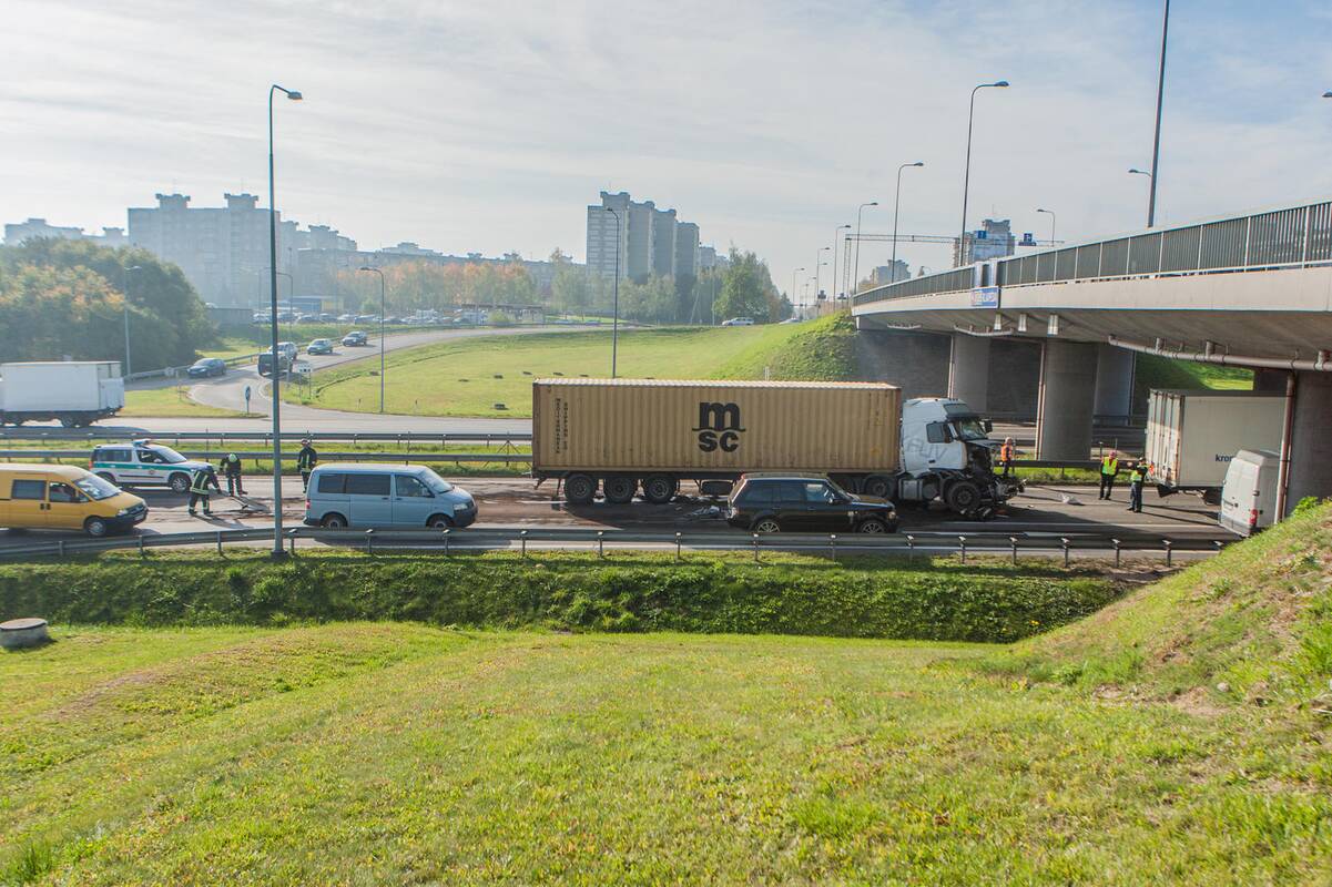 Policijos duomenimis, avarijos metu susidūrė trys vilkikai ir lengvasis automobilis „Volkswagen“. Po susidūrimo transporto priemonės gerokai apgadintos.