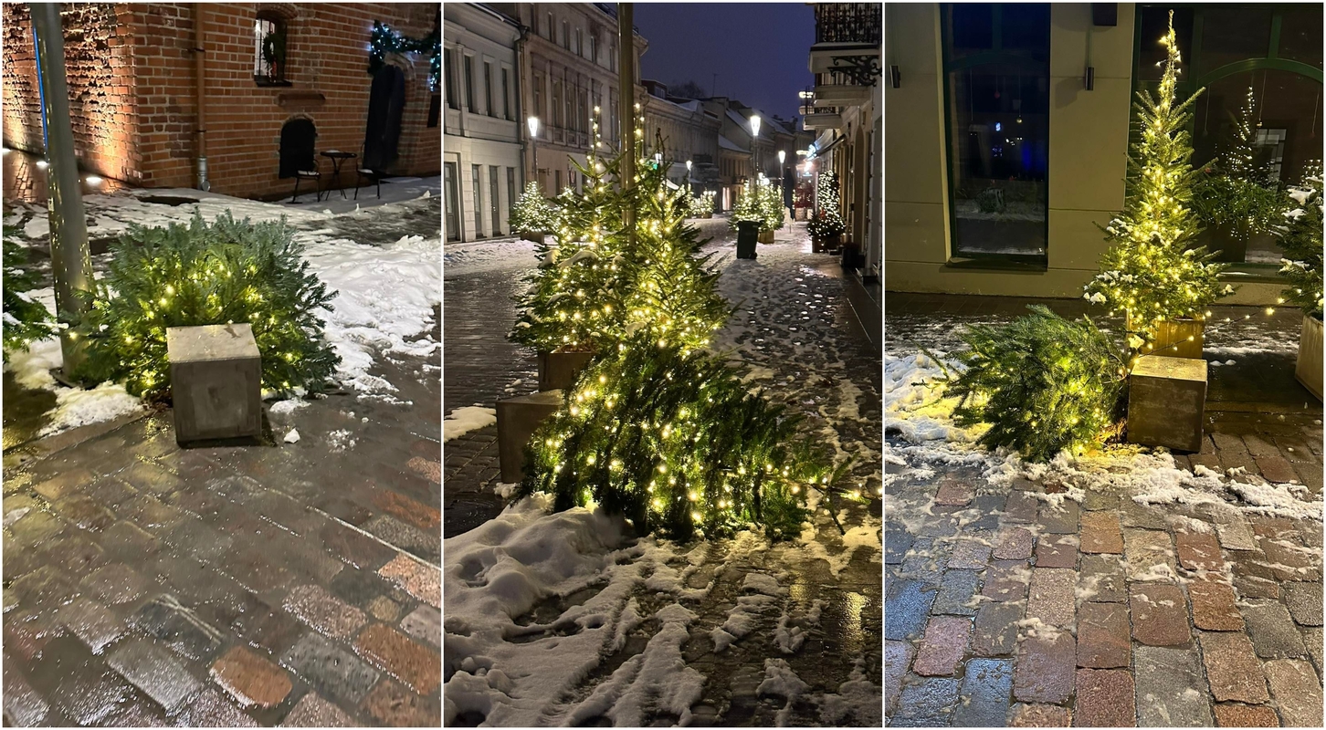 Tarsi auksu tviskantį taką, vedantį Kauno Kalėdų eglės link, sudarančios Vilniaus g. šventinę nuotaiką kuriančios eglutės buvo išvartytos.
