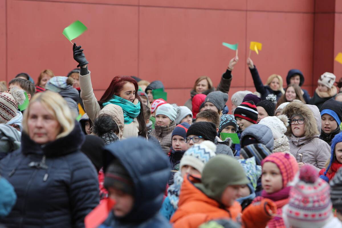 Dvi savaites ruošęsi ir iki smulkmenų repetavę savo šokį, pasirodymą moksleiviai pradėjo 11 val. Skambant Marijono Mikutavičiaus dainai „Aš tikrai myliu Lietuvą“ mažieji klaipėdiečiai bendru šokiu minėjo artėjančią Lietuvos nepriklausomybės atkūrimo dieną.