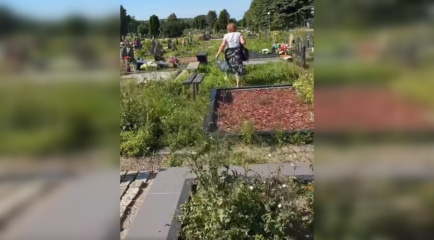 Vaizdo įraše matyti per kapinių teritoriją skubiu žingsniu nuo kapo nueinanti trumpais šviesiais plaukais, balta palaidine ir tamsiu sijonu vilkėjusi moteriškė. Vienoje rankoje ji laiko penkių litrų talpos tuščią butelį. Ant kito peties matyti maišas.