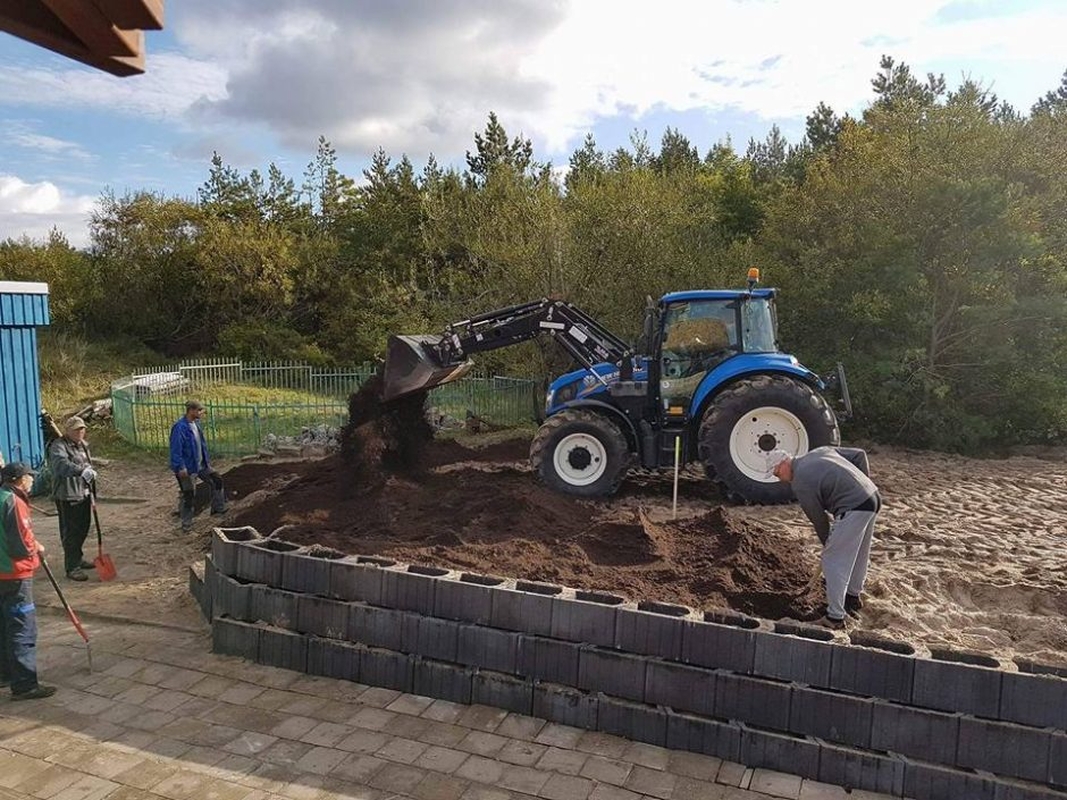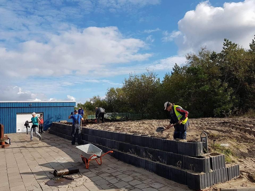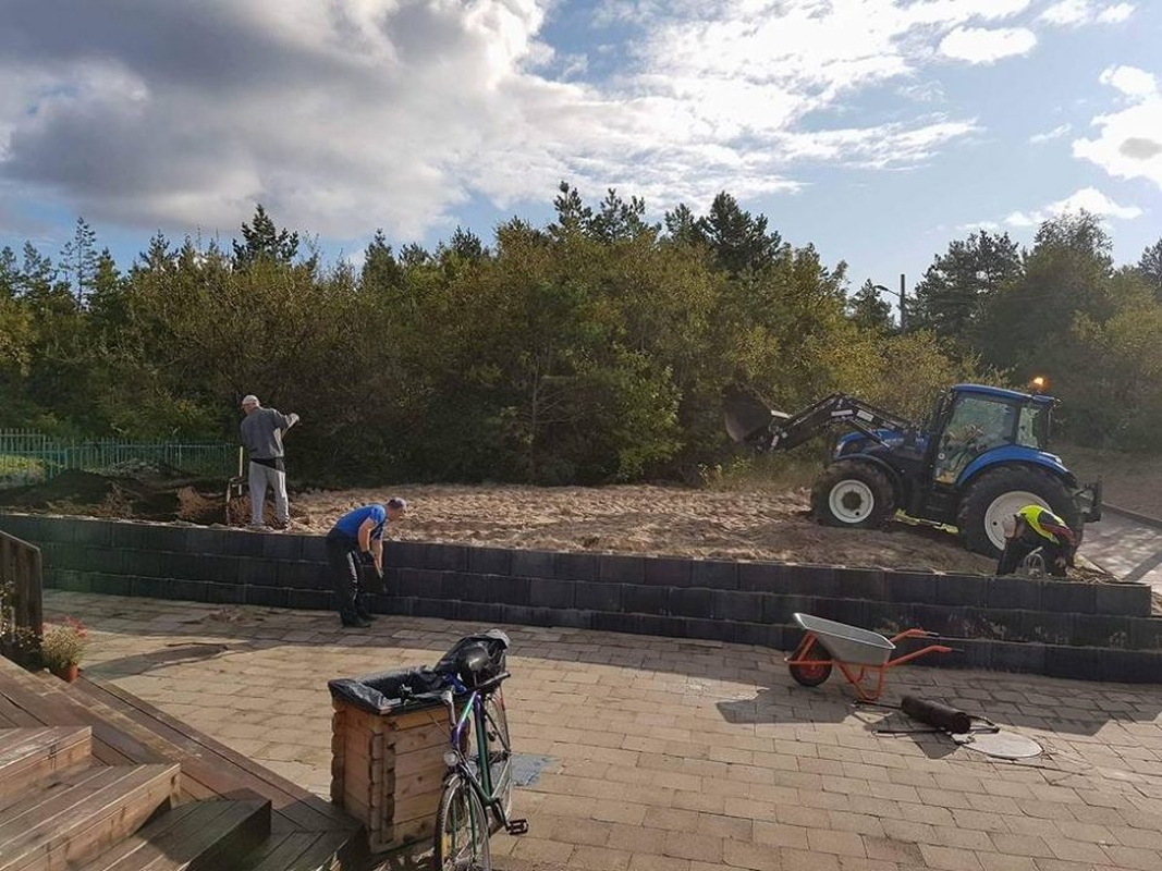Senoji sienelė buvo išmontuota. Nauja buvo suformuota iš blokelių. Ant viršaus buvo atvežta ir išpilta juodžemio. Bus pasodinta žolė.
