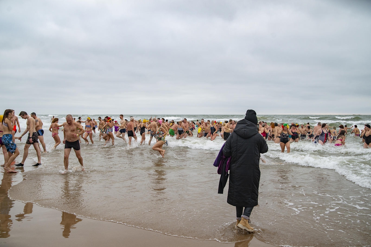 Nuo kranto atidžiai prižiūrint ugniagesiui gelbėtojui, vilkinčiam specialų hidrokostiumą, į gana banguotą jūrą nėrė keli šimtai sveikuolių, dar keliasdešimt tūkstančių žmonių jų maudynes stebėjo nuo jūros tilto ir paplūdimio smėlio.