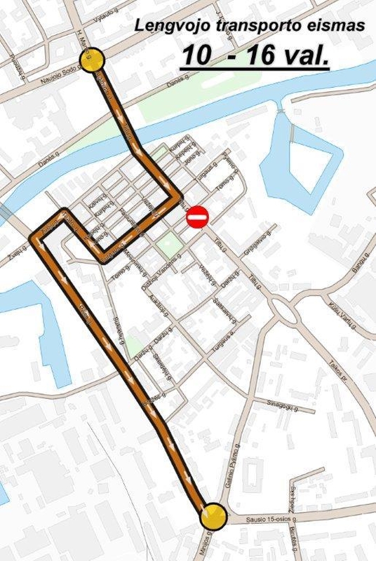 Visomis savaitės dienomis nuo 10 val. iki 16 val. lengvajam transportui bus atverta Tiltų gatvės dešinioji eismo juosta nuo Biržos tilto iki Turgaus gatvės, sankryžoje pasukant į dešinę ir toliau važiuojant Turgaus gatve. Teatro gatvėje pasukus kairėn į Žvejų gatvę toliau į pietinę miesto pusę galima važiuoti Pilies gatve.