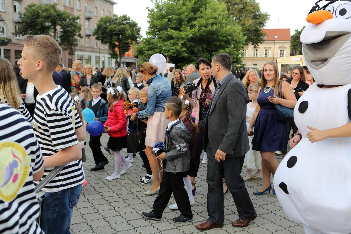 Kaip ir kasmet, per pirmąją naujų mokslo metų pamoką vasarišką nerūpestingumą gausiai susirinkusiems mokiniams priminė animacinių filmų personažai. Šie iki Martyno Mažvydo skulptūros atkeliavo motoroleriais.