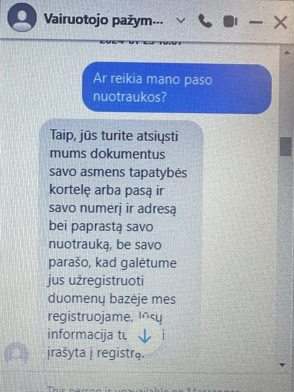 Jie atsakė labai greitai ir iškart paprašė atsiųsti visus savo duomenis, pradedant asmens kodu, gimimo vieta, data, adresu, telefono numeriu, nuotrauka ir baigiant parašu ant tuščio balto lapo.