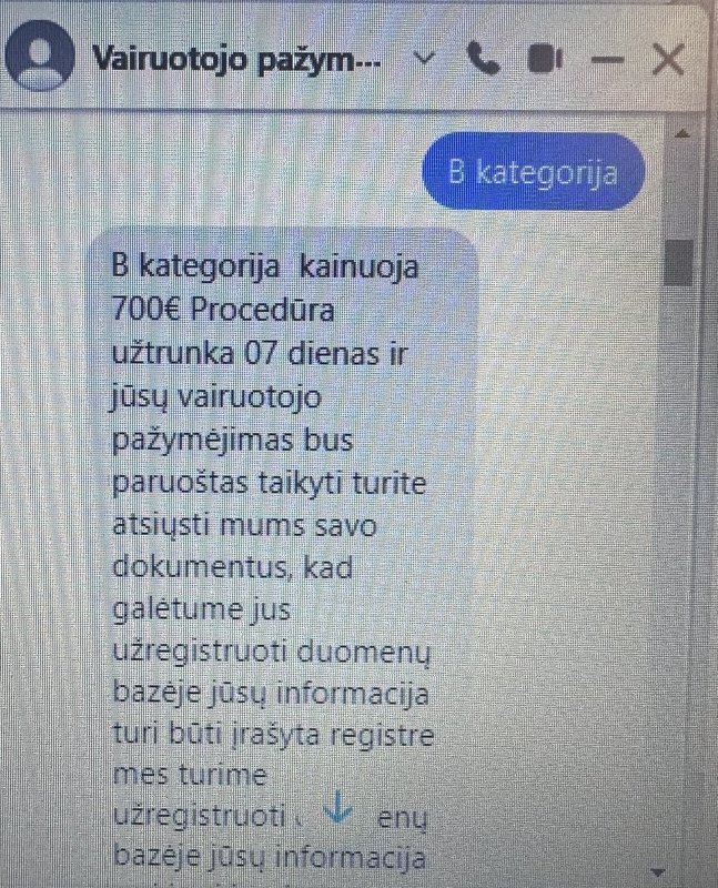 „B kategorija kainuoja 700 eurų. Procedūra užtrunka 7 dienas ir jūsų vairuotojo pažymėjimas bus paruoštas taikyti. Turite atsiųsti mums savo dokumentus, kad galėtume užregistruoti duomenų bazėje jūsų informaciją (šios ir kitų feisbuko paskyrų citatų kalba netaisyta – aut. past.)“, – toks siūlymas dar visai neseniai buvo skelbiamas feisbuko paskyroje „Vairuotojo pažymėjimas“.