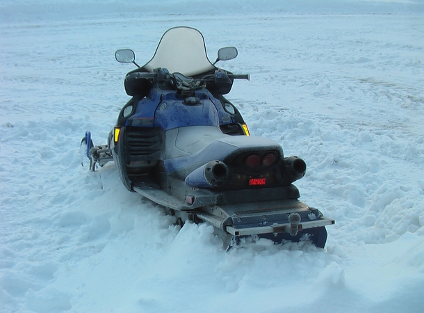 Nuotraukoje užfiksuoti du žmonės, laigę sniego motociklu.