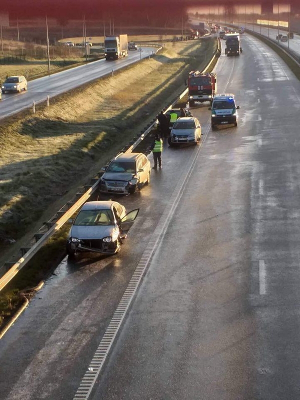 Pirminiais duomenimis, apie 7 val. 15 min. ant slidaus kelio susidūrė šeši automobiliai ir autobusas.