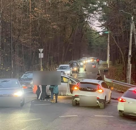 Eismo įvykio metu sugadintas automobilis ir kelio ženklas.