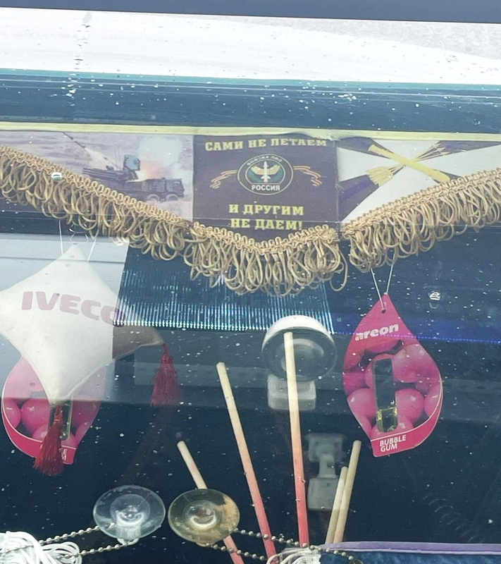Joje buvo atvaizduotas PGP logotipas, jį supanti Georgijaus juosta, priešlėktuvinės gynybos sistema, taip pat užrašas rusų kalba „Patys neskraidom ir kitiems neleidžiam“.