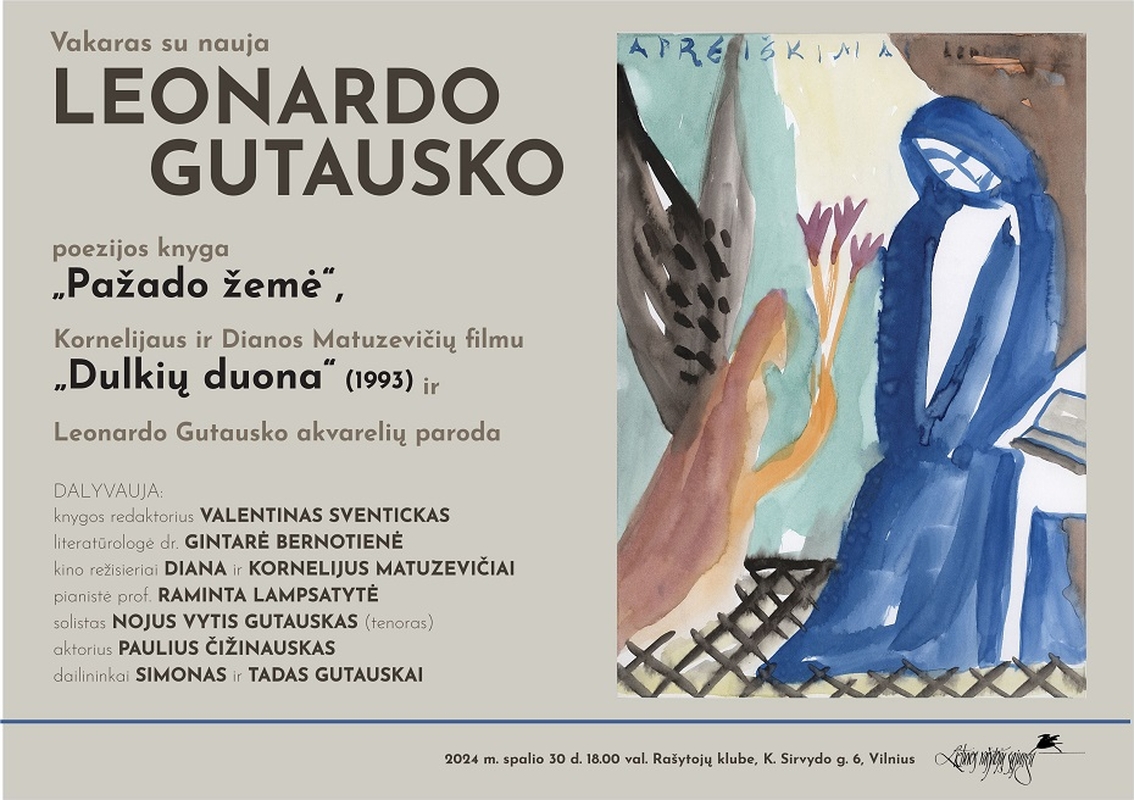 Vakare dalyvaus literatūros kritikas ir knygos sudarytojas Valentinas Sventickas, literatūrologė dr. Gintarė Bernotienė, kino režisieriai Diana ir Kornelijus Matuzevičiai, aktorius Paulius Čižinauskas, dailininkai Simonas ir Tadas Gutauskai, koncertuos solistas Nojus Vytis Gutauskas ir pianistė prof. Raminta Lampsatytė. Klubo salėje veiks Leonardo Gutausko akvarelių paroda, bus rodomas Dianos ir Kornelijaus Matuzevičių filmas „Dulkių duona“ (1993).