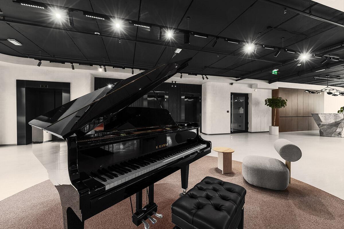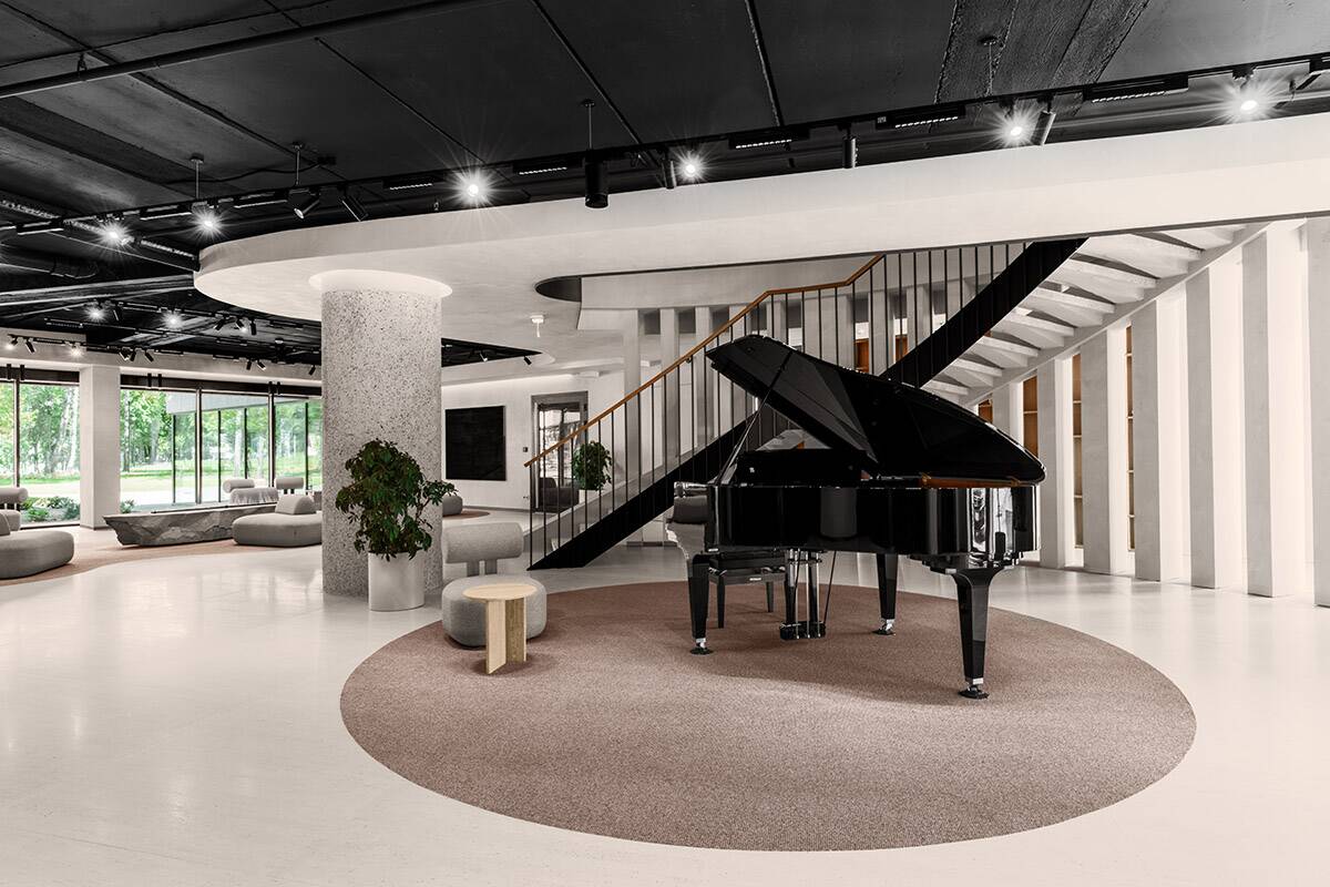 „Nemuno by CITUS“ bendrųjų erdvių širdis – vestibiulis su recepcija, jaukumą kuria židinys ir muzikiniai akcentai. Trys akcentai kuria projekto charakterį. Pirmasis – lieto betono, rankų darbo recepcijos baldas su subtiliai paslėpta M. K. Čiurlionio paveikslo interpretacija. Tai – detalė, kurią dažnas pastebi tik įsižiūrėjęs: joje atsikartoja vieno kūrinio fragmentas, matomas ir ant pastato fasado. Antrasis – vandens garų židinys: vizualiai jis sukuria liepsnos efektą, bet neskleidžia suodžių, o yra prijungtas prie vandentiekio, todėl gali veikti nepertraukiamai ir nereikalauja beveik jokios priežiūros. Ir, žinoma, fortepijonas, kuris tiesiogiai apeliuoja į M. K. Čiurlionio muzikinę kūrybą.