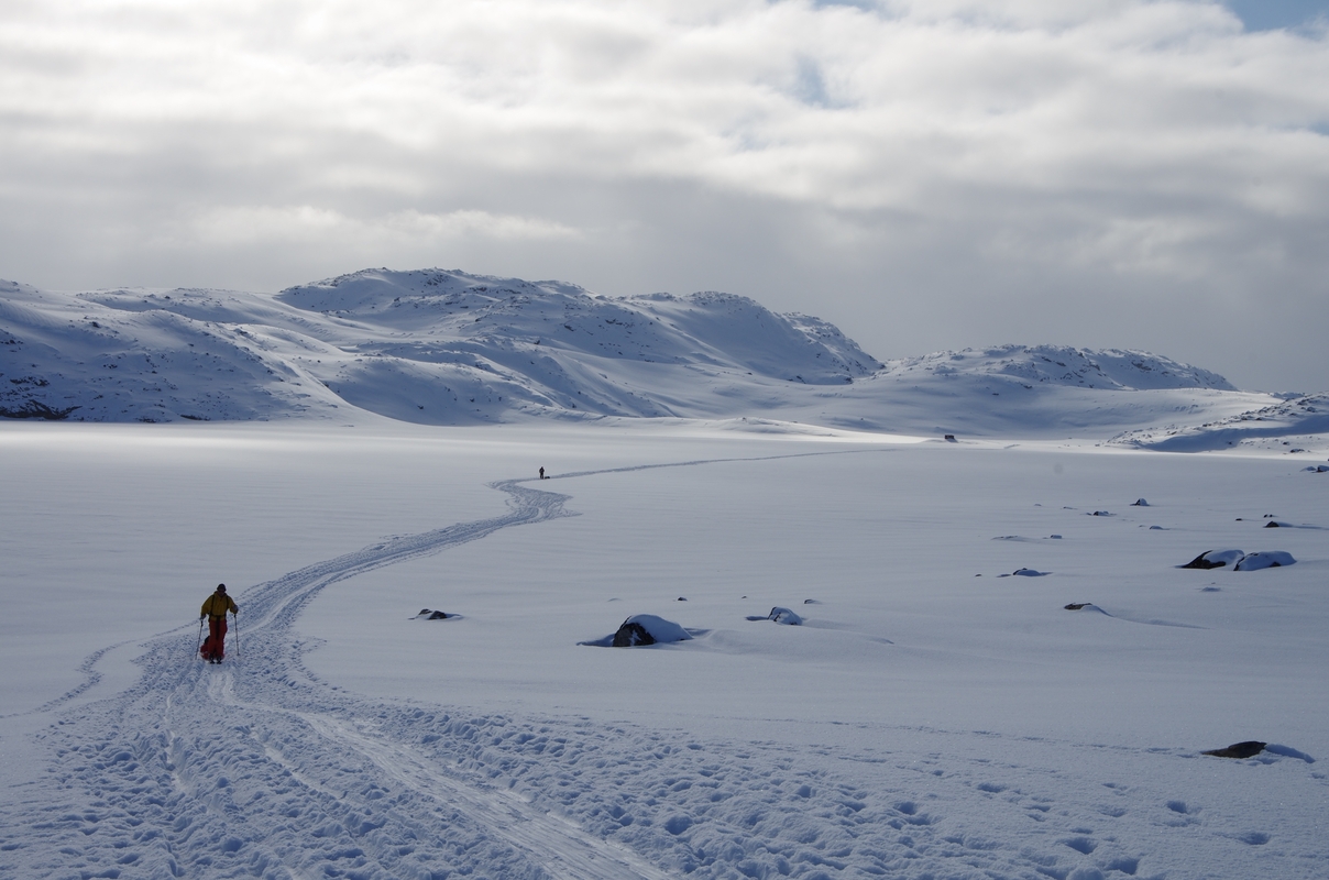 Nusileidę slėniu, kur beveik nebuvo sniego, kito fiordo link, keliautojai išvydo, kad po nakties lietaus užšalęs paviršius telkšojo vandenyje. 15 km lietuviai šliuožė ledu ir telkšančiu vandeniu. Laimė, kad ledas neįlūžo.