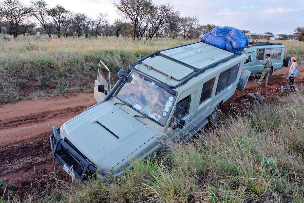 Kol kas gyvūnų – nė kvapo. Svarstome, kada juos pamatysime, – negi tik kirtę Serengečio demarkacinę liniją? Tarpais apvažiuojame dar neseno liūčių sezono padarinius – upių krantai dažnai neatlaiko vandens gausos vagose, tada stichija stipria srove išsilieja ir užtvindo viską, ką randa pakeliui: tiltus, medžius, kelius ir žemose vietose įsikūrusias gyvenvietes, žmones, gyvulius.