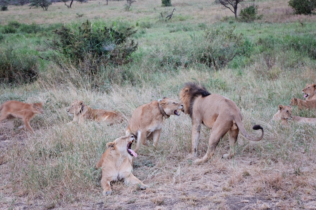 Lengvai švelnaus vėjelio šiurenamoje gelsvoje savanos žolėje tingiai murkso gal koks penkiolika ar daugiau didžiulių katyčių. Mums sustojus visai šalia, jos tingiai pakelia nuobodžiaujančius snukius, kai kurios iš jų smalsiai keliasi, artėdamos prie automobilio. Vaje... Mes – pačioje liūtų irštvoje. Žiū – keletas iš jų, rodos, labai susidomėję atvykėliais, jau supa mus iš užnugario. Darosi kažkaip ir nejauku. O ką gidas? Tik šypsosi pro ūsą savo pakirmijusiais priekiniais dantimis ir stebi mūsų reakciją. Mes iš netikėtumo – jau antrą safario dieną pamatyti šitiek liūtų, ir dar iš taip arti! – stačiai nebežinome, džiaugtis čia labiau, ar bijoti?..