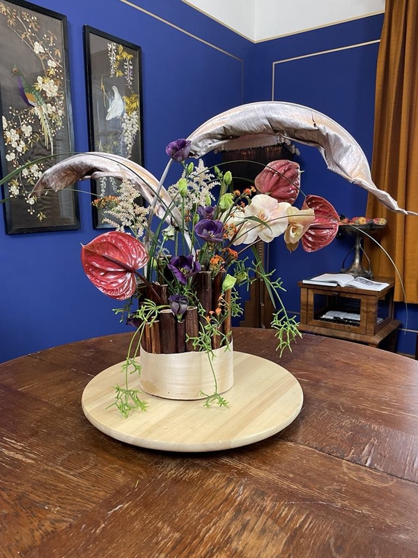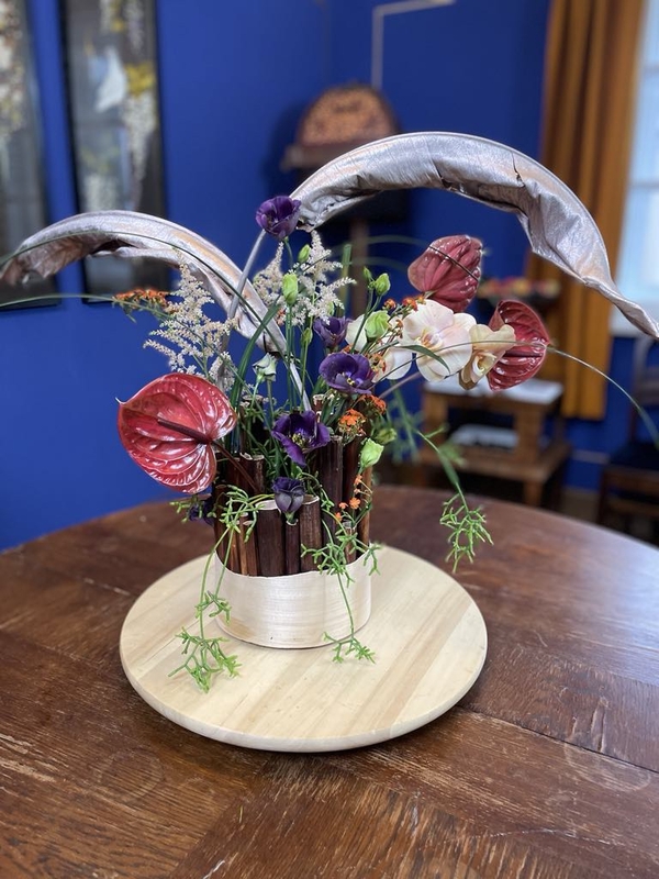 Kompozicija bus sudaryta iš intensyvių spalvų gėlių – chrizantemų, anturių, orchidėjų, lauralapio putino, pluoštinio zelandlinio, lily grass žalumos, ripsalio.