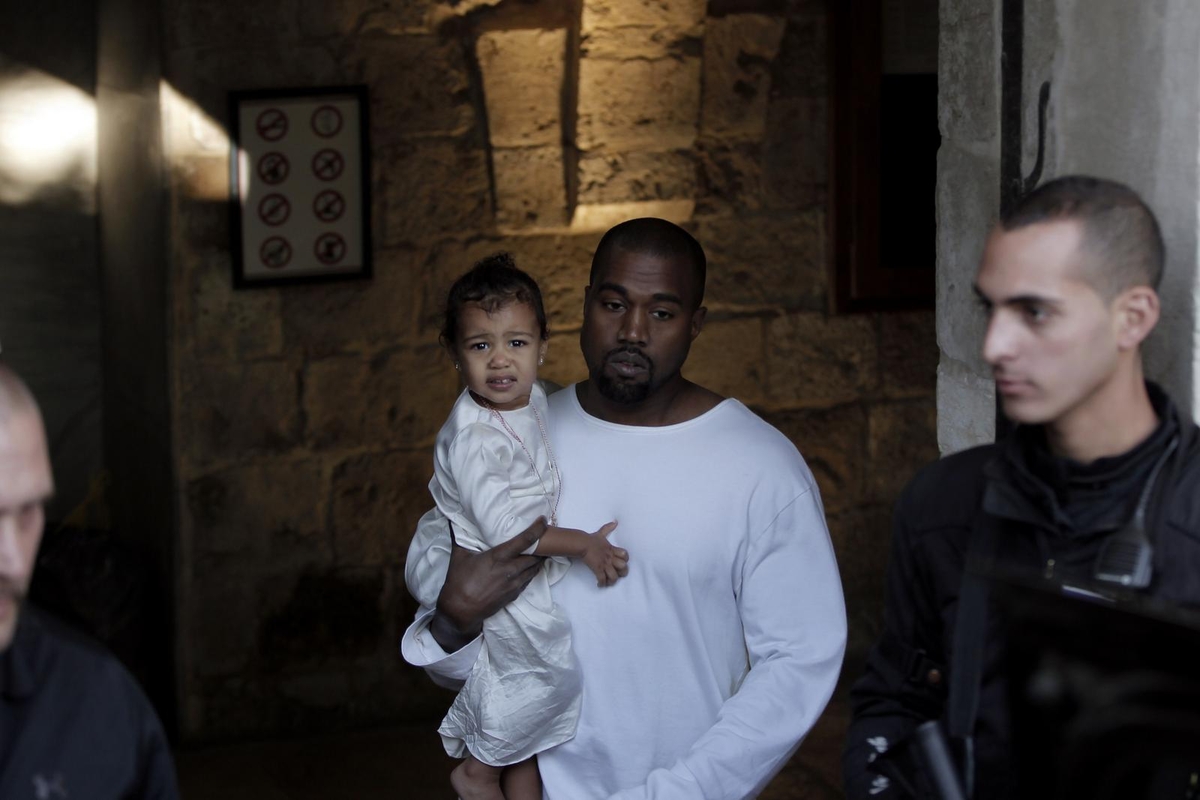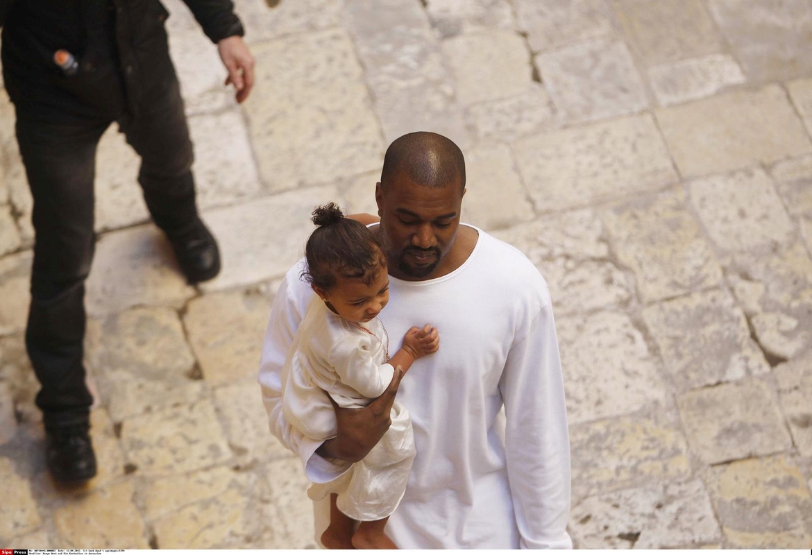 Kim Kardashian dėvėjo iki žemės krentančią kuklią klostuotą auksinę suknelę su ilgomis rankovėmis, o jos dukra buvo apvilkta balta suknele. North kojytės buvo basos, nors šiuo metu oras Jeruzalėje yra nebūdingai šaltas. K.Westas irgi buvo apsirengęs baltai.