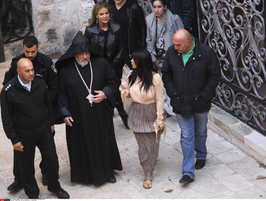 Automobilių kolonai siauromis gatvėmis privažiavus į Šv.Jokūbo katedrą armėnų kvartale, šimtai leipstančių ir šūkalojančių gerbėjų ėmė spaustis apie automobilį, iš kurio išlipo Kim Kardashian su savo 21 mėnesio dukrele.