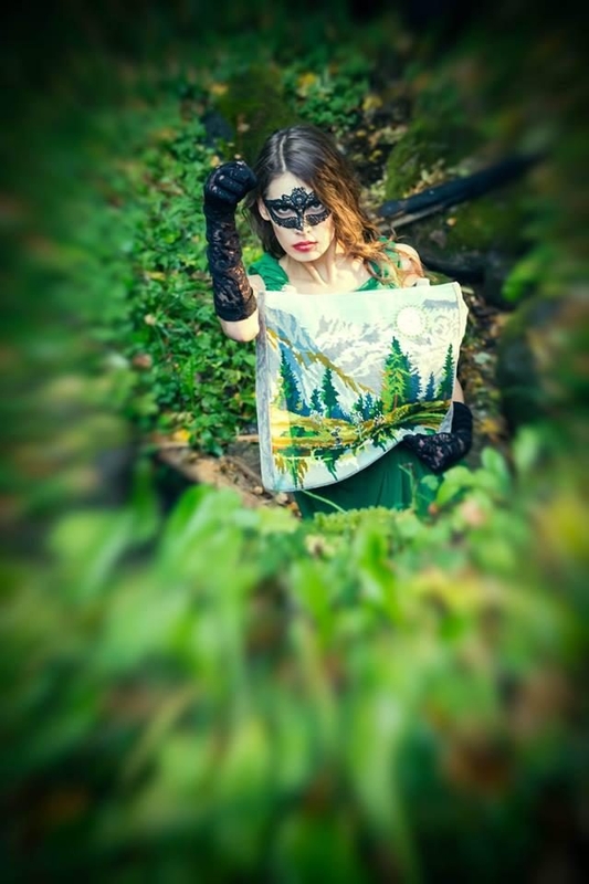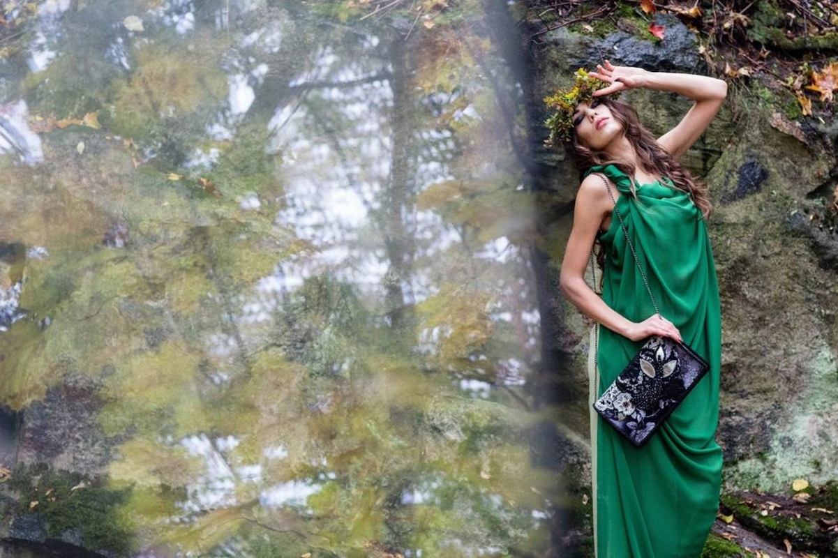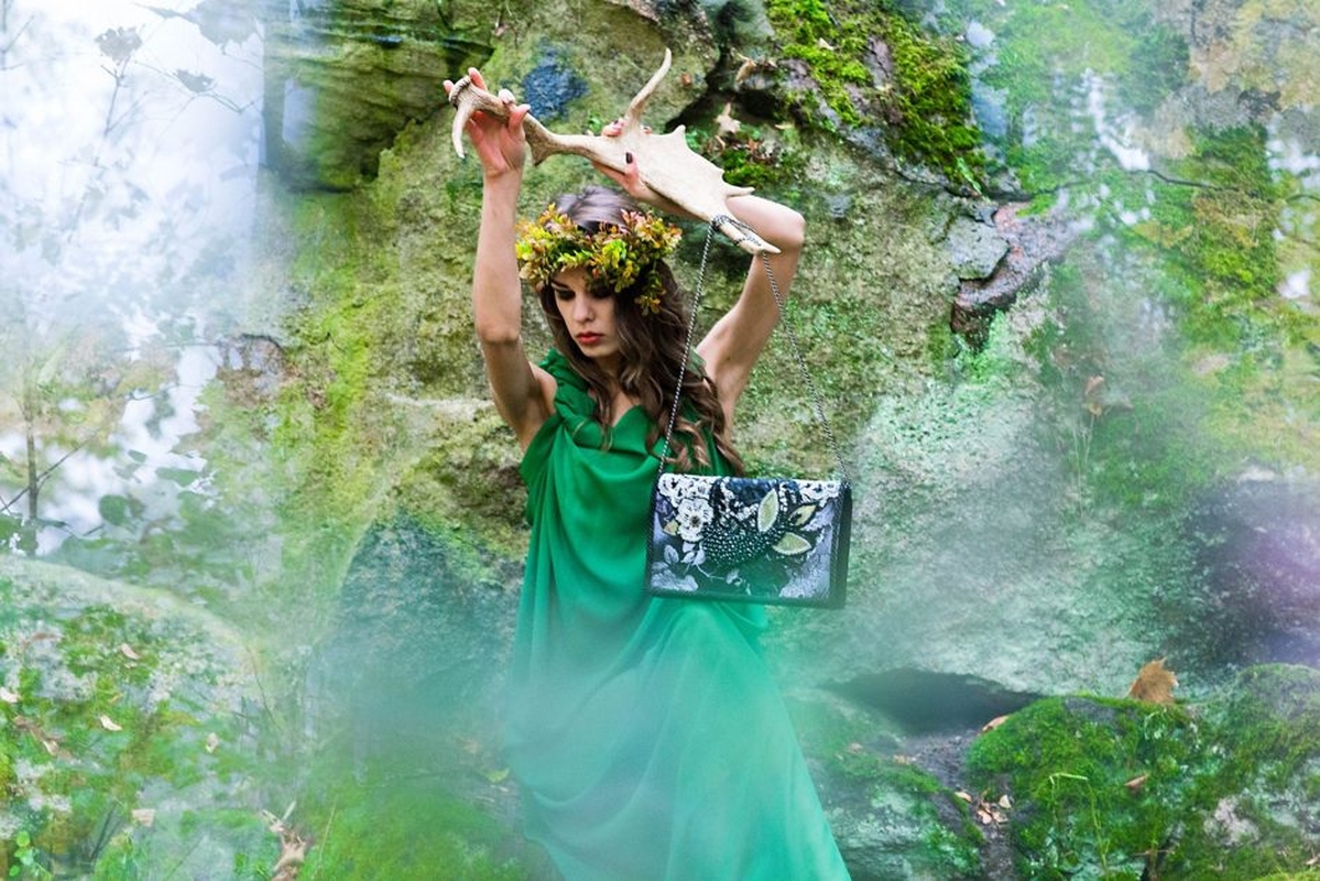 Rankinių dizainerė R. Rožinskienė su šypsena pasakojo, jog norint, kad visiems fotosesijos dalyviams būtų lengviau įsijausti, bevažiuojant mašina sukurta pasaka apie miško deivę. G.Indičianskytė turėjo vaidinti mistišką būtybę, kurią, saulei kylant, galima sutikti Lentvario miškų apylinkėse. Naktį ji negali išeiti iš Pilies Vaiduoklės, kurioje gyvena ir kuria rankines – t.y. atidavinėja kūrybinę duoklę miško dievams už galimybę peržengti anapusinio pasaulio ribas bei atsidurti čia ir dabar – kvepiančiame ryto rasa miške, ant drėgnų samanų, kur viskas gyva ir tikra – kruta, čiulba, ropoja... Ji be galo dėkinga dievams už galimybę pasijusti Visatos dalimi. Už galimybę gyventi čia ir dabar. Dienomis ji semiasi pozityvios miško gyvybinės energijos savo naktinei kūrybai, kurios nepasilieka sau – aukoja miško dievams, nes... visas mūsų gyvenimas turėtų būti auka.