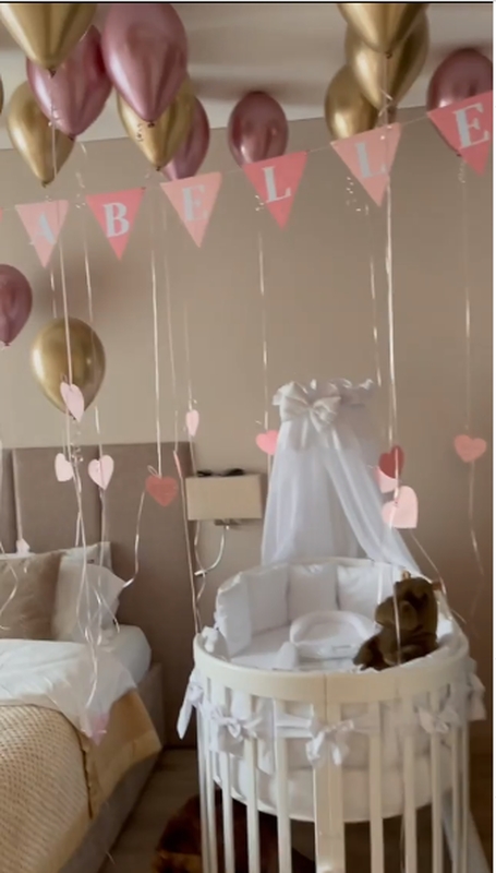 Isabelle Meschino Ježerys gimimo proga artimieji duris papuošė rausvu kaspinu ir mergaitės suknelę simbolizuojančia dekoracija, o namuose netrūko širdelių ir balionų.