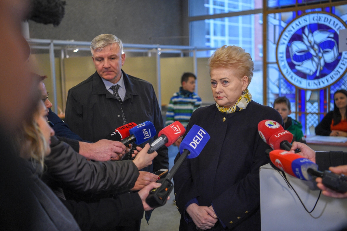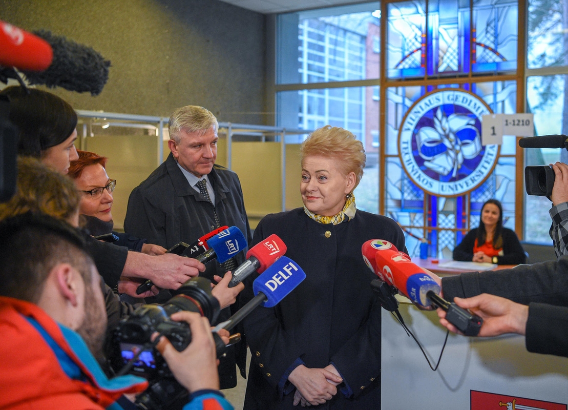„Už patį geriausią, geriausiai dirbantį, nevagiantį“, – žurnalistams sakė šalies vadovė, mesdama biuletenį į urną sostinės Saulėtekio rinkimų apylinkėje.