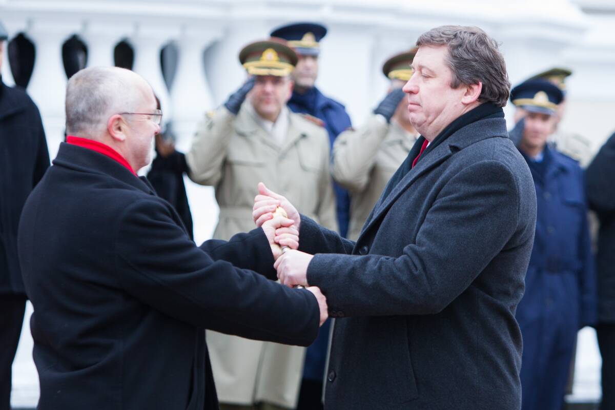 Joje ketverius metus ministerijai vadovavęs Juozas Olekas naujajam ministrui Raimundui Karobliui perdavė ministerijos vėliavą ir įteikė valdžios regaliją – skeptrą.
