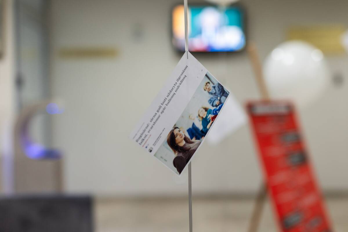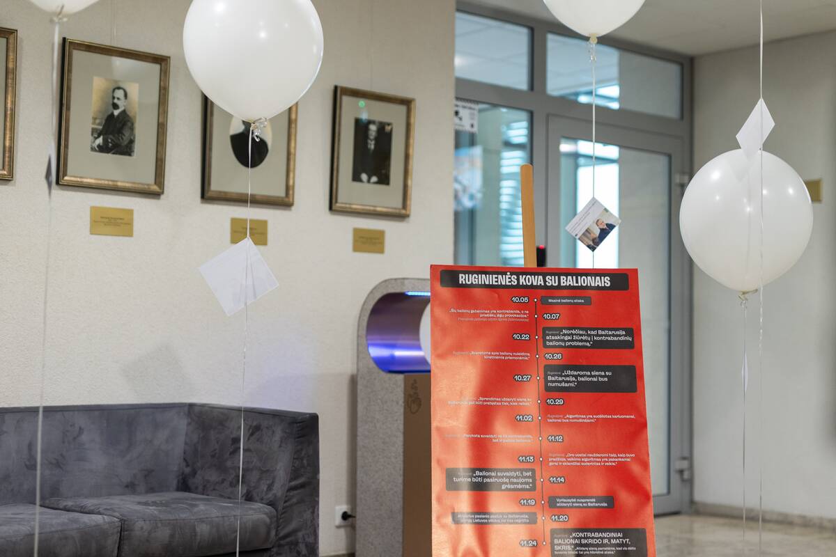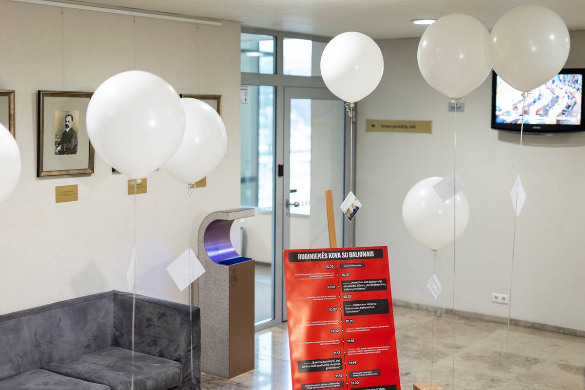 Prie balionų virvučių prikabintos ištraukos su Ministrų kabineto narių teiginiais: „Premjerė: balionai suvaldyti, bet turime būti pasiruošę naujoms grėsmėms“, „Vladislavas Kondratovičius: daromas spaudimas Baltarusijai mažina kontrabandinių balionų srautą“ ir kiti.