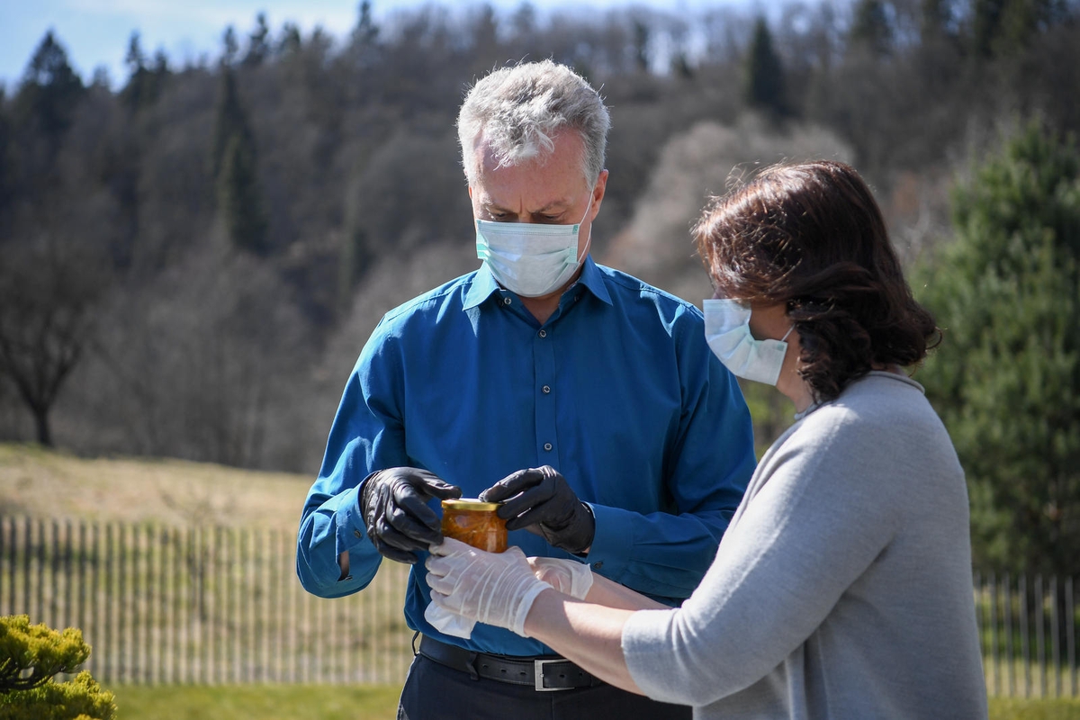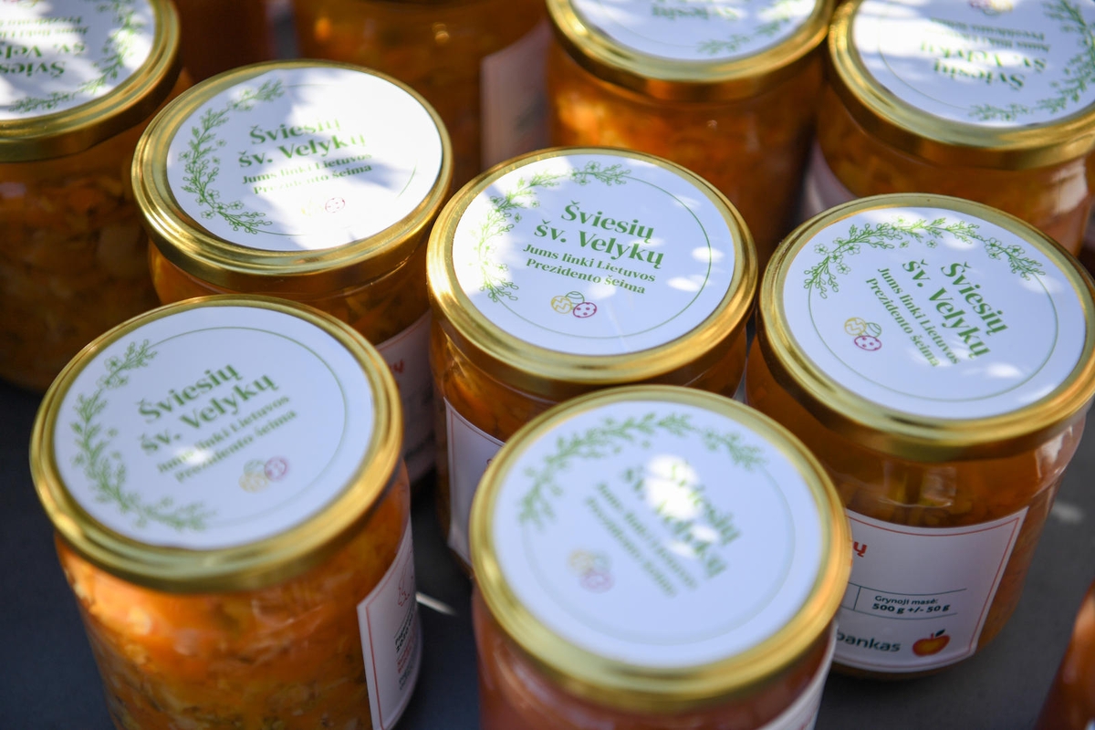 Ponia Diana su prezidentu savo kieme ant konservų stiklainiukų užklijavo lipdukus su šviesių šv. Velykų linkėjimais nuo savo šeimos.