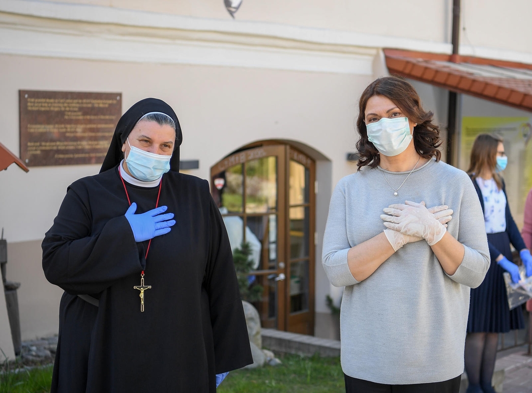 Pirmoji ponia perdavė dovaną prie hospiso durų, o su jo įkūrėja seserimi Michaela Rak apsikabino simboliškai per atstumą.