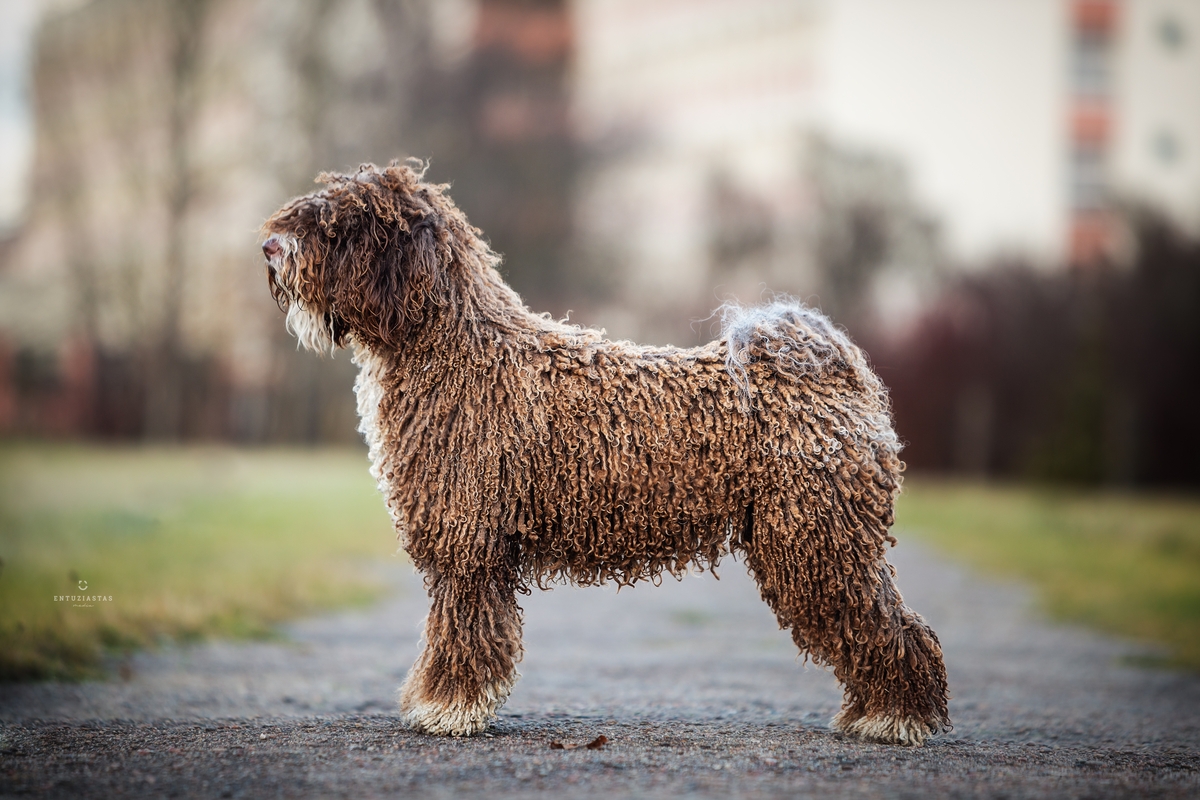 Tiesa, ypatingos priežiūros reikalauja šios veislės šunų kailis. Anot pašnekovės, ispanus reikia skusti 1–2 kartus per metus. Ispanų kailis garbanotas, panašios į vilną struktūros, gali susisukti į dredus. Jei šuo skutamas, su juo nieko daryti nereikia, tačiau su ilgu kailiu yra nemažai darbo. Ispanų kailio negalima šukuoti, o kiekvieną dredą reikia atskirti rankomis, kad nesusidarytu sąvėlos ir oda galėtų kvėpuoti.
