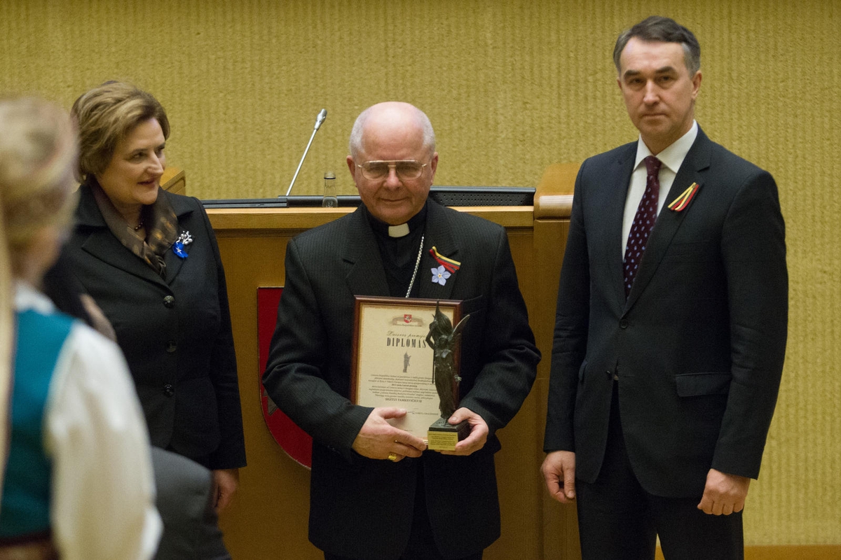 Jis pabrėžė, kad jam skirta Laisvės premija priklauso daugeliui - nuo tremtinių vyskupų Vincento Sladkevičiaus ir Julijono Steponavičiaus iki tikinčių mokinukų, kurie per sovietmetį drįsdavo klasėje viešai išpažinti savo tikėjimą, o sekmadienį - ateiti į bažnyčią.