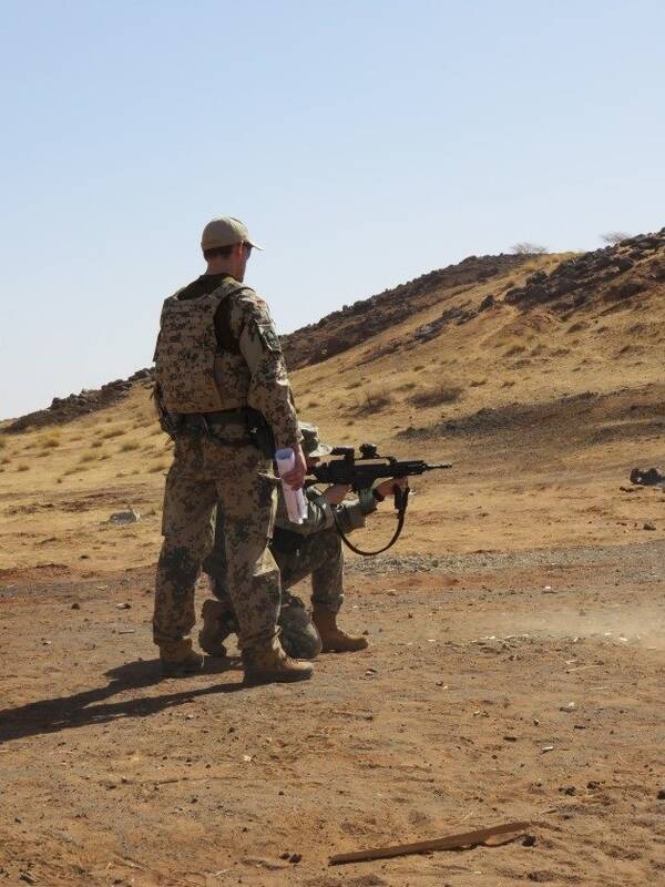 Lėktuvas nusileido Bamake, vasario 15 dienos vakare. Kaip ir tikėjausi, Afrikos klimatas pasitiko mus karšto oro gūsiu, tvyrojo nenusakomas smėlio ir dulkių kvapas. Kitą dieną skridome į Gao. Viso skrydžio metu žiūrėjau pro lėktuvo langą ir stebėjausi skurdžia gamta – raudonas smėlis, jokios žalumos, tik išdžiūvusios upių vagos. Tai – sausasis sezonas Afrikoje. Dienomis temperatūra pakyla iki +45, o naktimis „atšala“ iki +25. Pirmasis įspūdis atvykus į didžiulę „Camp Castor“ bazę – labai šiltas, prisotintas draugiškos atmosferos ir geros nuotaikos. Čia įsikūrę apie 1400 karių: vokiečiai, belgai, estai, olandai, čekai, latviai, šveicarai ir visi – šypsosi, sveikinasi. Atėję vakarieniauti, džiaugėmės, kai belgų karys pasisveikino lietuviškai. Mūsiškius čia gerai pažįsta, nes atvažiavę pakeitėme KASP Prisikėlimo apygardos rinktinės karius iš Šiaulių. Mums jau lengviau, tačiau atsakomybės tai nesumažina. Mes, Vyčio apygardos rinktinės kariai savanoriai esame atsakingi už beveik pusantro tūkstančio karių ir visos bazės perimetro saugumą! Po dvi dienas trukusių instruktažų apie gyvenimą ir saugumo tvarką bazėje, pradėjome tarnybą – dvi paras budime, vieną poilsiaujame. Tiesa, ir tądien ne visuomet pavyksta pailsėti, nes pasitaiko mokomieji aliarmai, kurių metu tikrinama reakcija į netiesioginį apšaudymą arba stiprinamas bazės apsaugos perimetras. Per du misijos mėnesius dalyvavome kovinio šaudymo pratybose su automatiniais ginklais G-36 ir vokiečių gamybos pistoletu P8A1, kurio valdymas nedaug kuo skiriasi nuo pistoleto GLOCK. Treniravomės vokiečių paramedikų organizuotose pirmos pagalbos pratybose, kur pasidalinome patirtimi su kolegomis, atnaujinome žinias. Taip pat skyriaus sudėtyje nuolat treniruojamės taiklaus šaudymo principų, tam, kad išlaikytume vieną svarbiausių šioje misijoje gebėjimų, juk, atėjus laikui, mes turime būti pirmi. Su priešu mums neteko susidurti, todėl kol kas pagrindinė mūsų „kova“ yra karštis ir miegas, o „ginklai“ prieš juos yra vanduo ir kava.