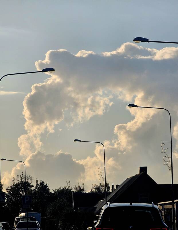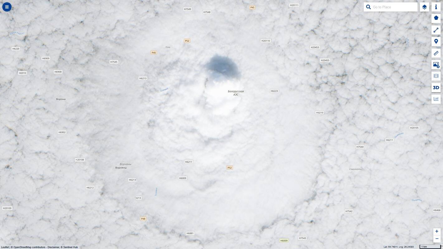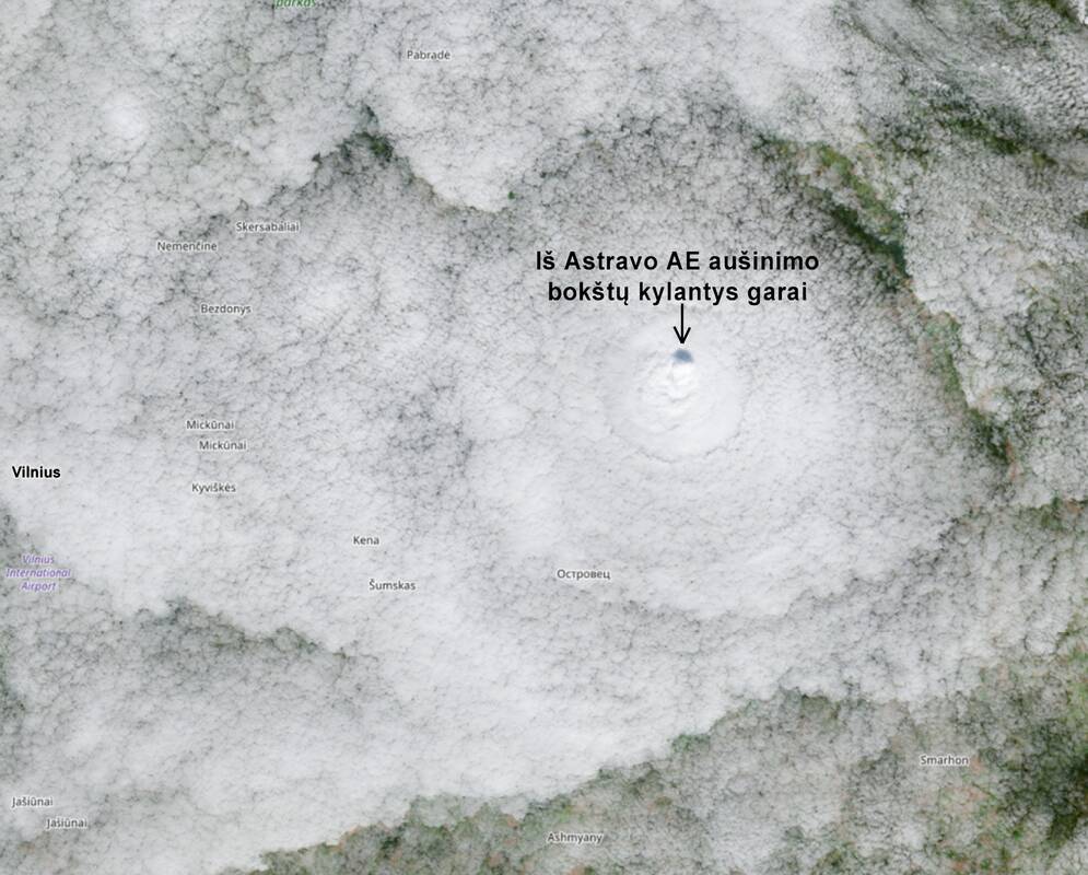 „Nuotrauka – iš serijos „Tik nerodykite to sąmokslo teorijų skleidėjams“, nes po to prisigalvos kažko apie geoinžineriją. Štai taip gana įspūdingai spalio 7 dieną atrodė iš Astravo AE aušinimo bokštų kylantys garai. Galima matyti ne tik aukštą (nes meta šešėlį) garų stulpą, tačiau ir debesų „akį“. Ant šitų (ypač esančių menamos akies vyzdyje) jau galima sakyti, jog jie nenatūralūs, nes tikrai susiformavo dėl elektrinės (t. y. žmogaus veiklos). Tiesa, jeigu nebūtų ten veikiančios elektrinės, tai sluoksniniai debesys vis tiek ten būtų buvę. Tiesiog tos akies formos šioje nuotraukoje nematytumėme. Debesų masyvas atrodytų vientisesnis“, – anot meteologo G. Valaikos, aukštai pakilusių garų įtaka sluoksniniams debesims buvo matyti net apie 20 kilometrų spinduliu aplink atominę elektrinę.