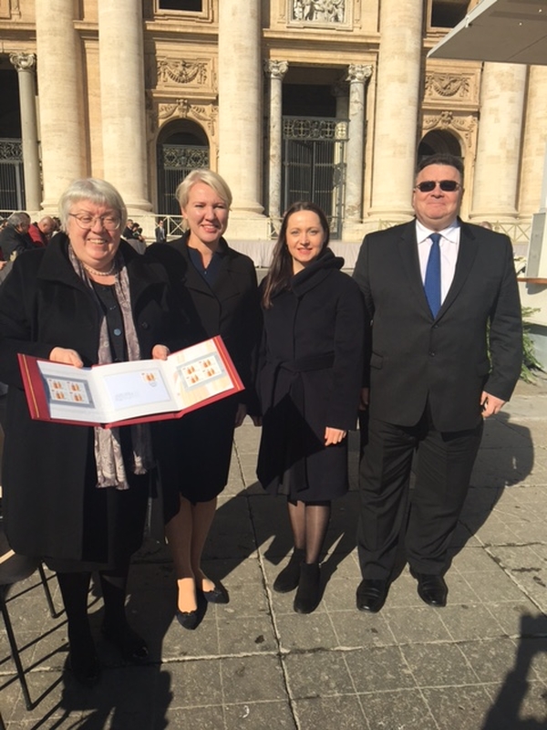 Į Vatikaną pristatyti Popiežiui Pranciškui pašto ženklą kartu su užsienio reikalų ministru L.Linkevičiumi vyko Lietuvos pašto generalinė direktorė L. Minderienė bei bendrovės Korporatyvinių reikalų departamento vadovė Rasa Kruopaitė-Lalienė.