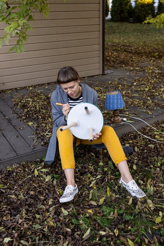 – Oi, pradžia buvo nuo nulio. Neturėjau nei įrankių, nei supratimo, kaip šitie dalykai daromi. Mano gera bičiulė turėjo dirbtuves, kuriose siūdavo iš vilnos akustines pertvaras. Paprašiau jos stalo kampo, vietelės, kur galėčiau ką nors pati pakrapštyti. Pamenu, atsinešiau telefoną su patikusių baldų nuotraukomis ir užrašų knygutę. Nė minutei neapleido jausmas, ką aš čia veikiu ir kodėl? Turėjau nusipirktą taburetę ir paauglystės laikų drabužių su man patikusiais raštais. Apklijavau ją tais audiniais.