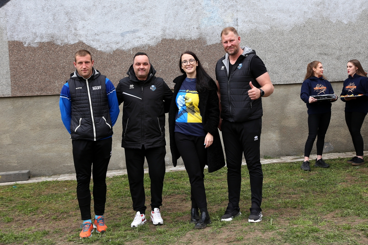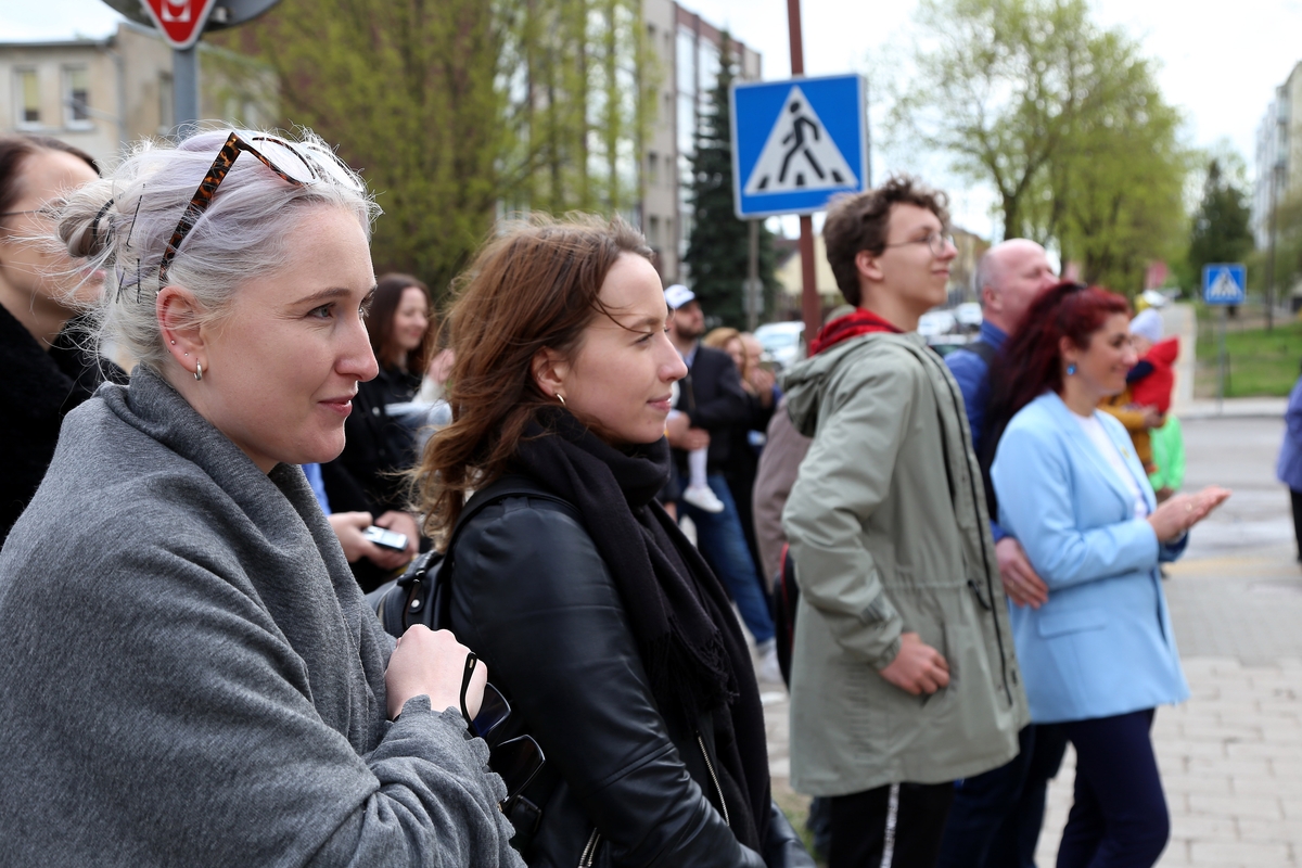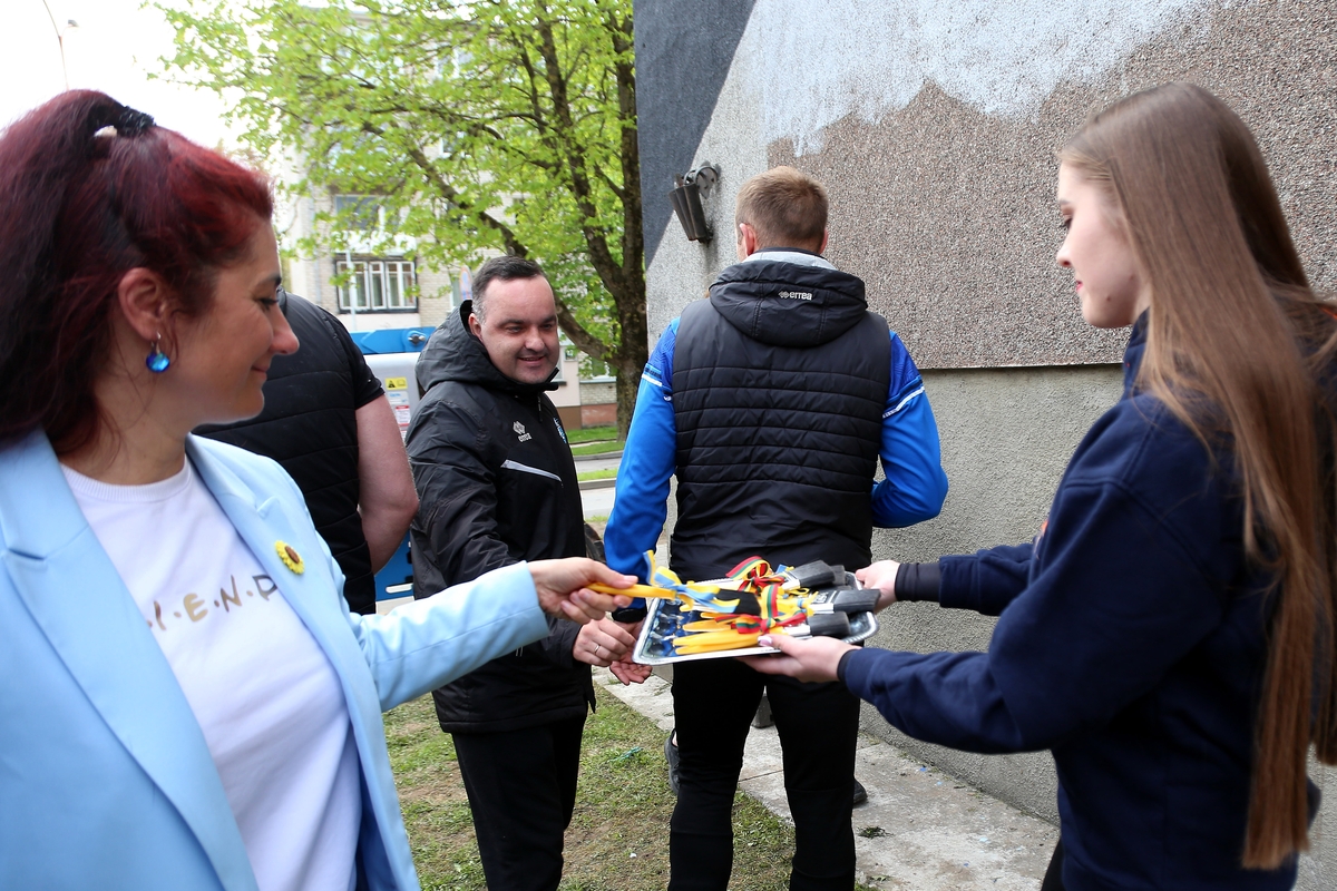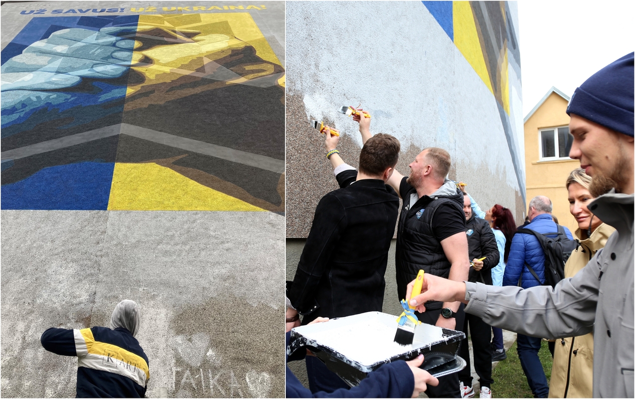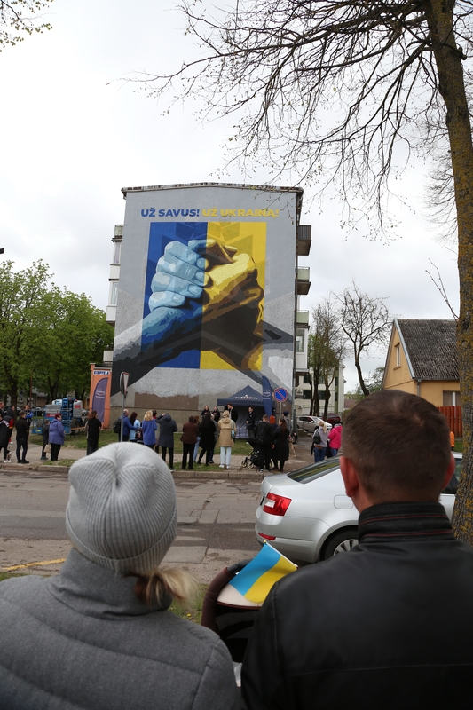 Daugiau kaip 100 kvadratinių metro ploto meno kūrinys – mėlynos ir geltonos spalvos piešinys, vaizduojantis tvirtą rankų susikibimą, – padengė miesto centre, Ežero gatvėje, stovinčio daugiabučio sieną.